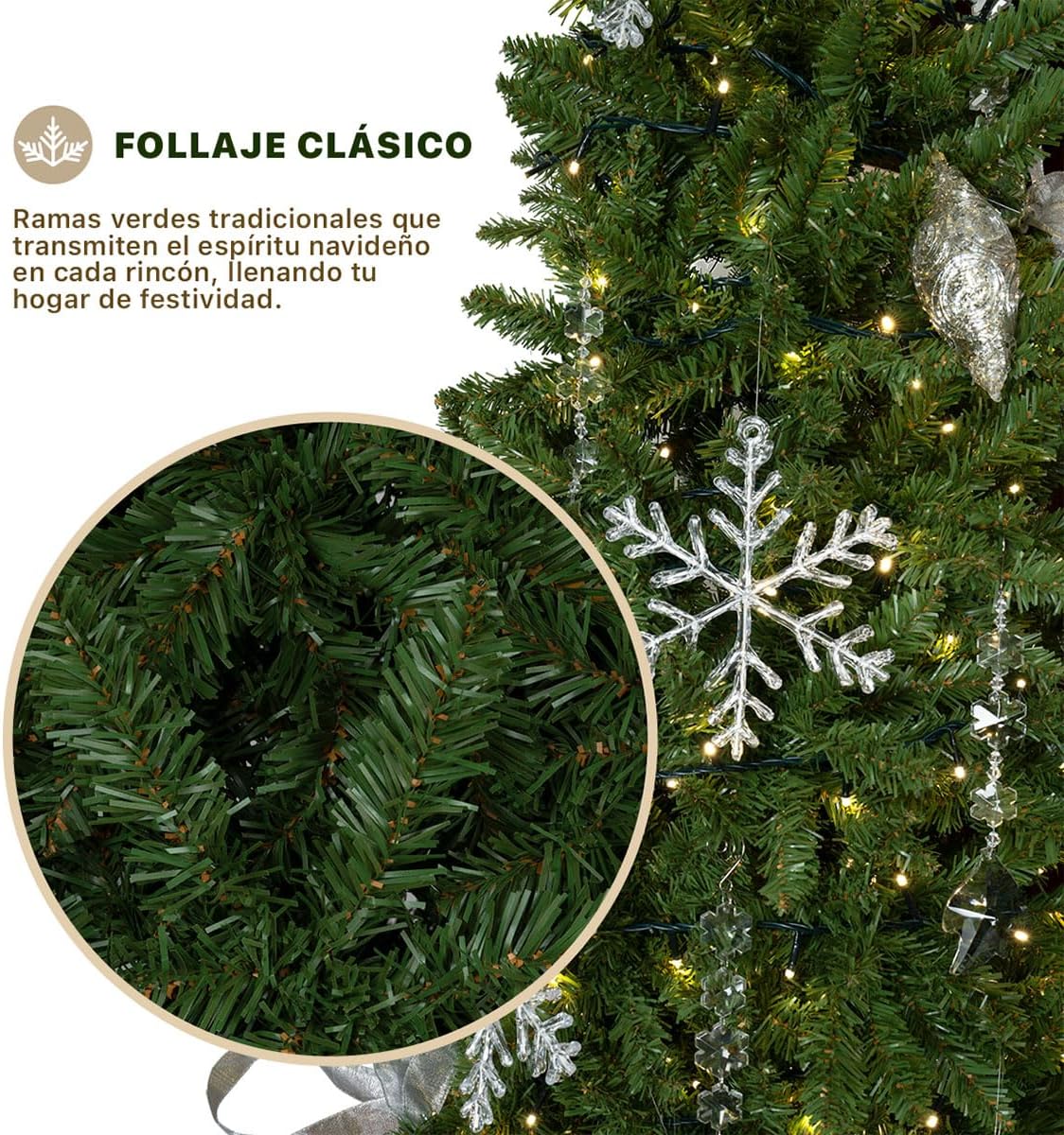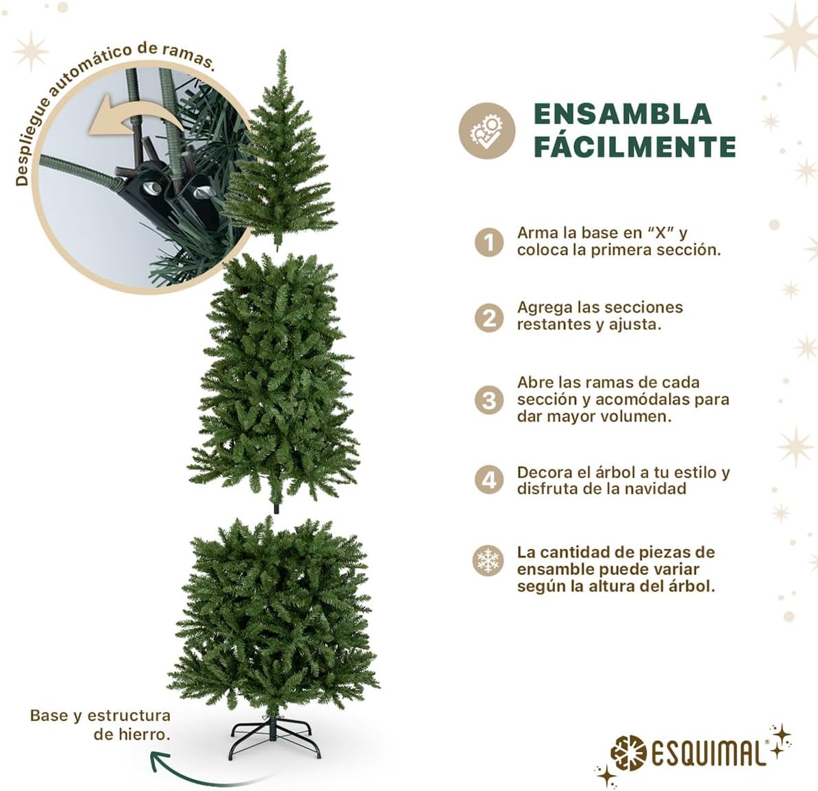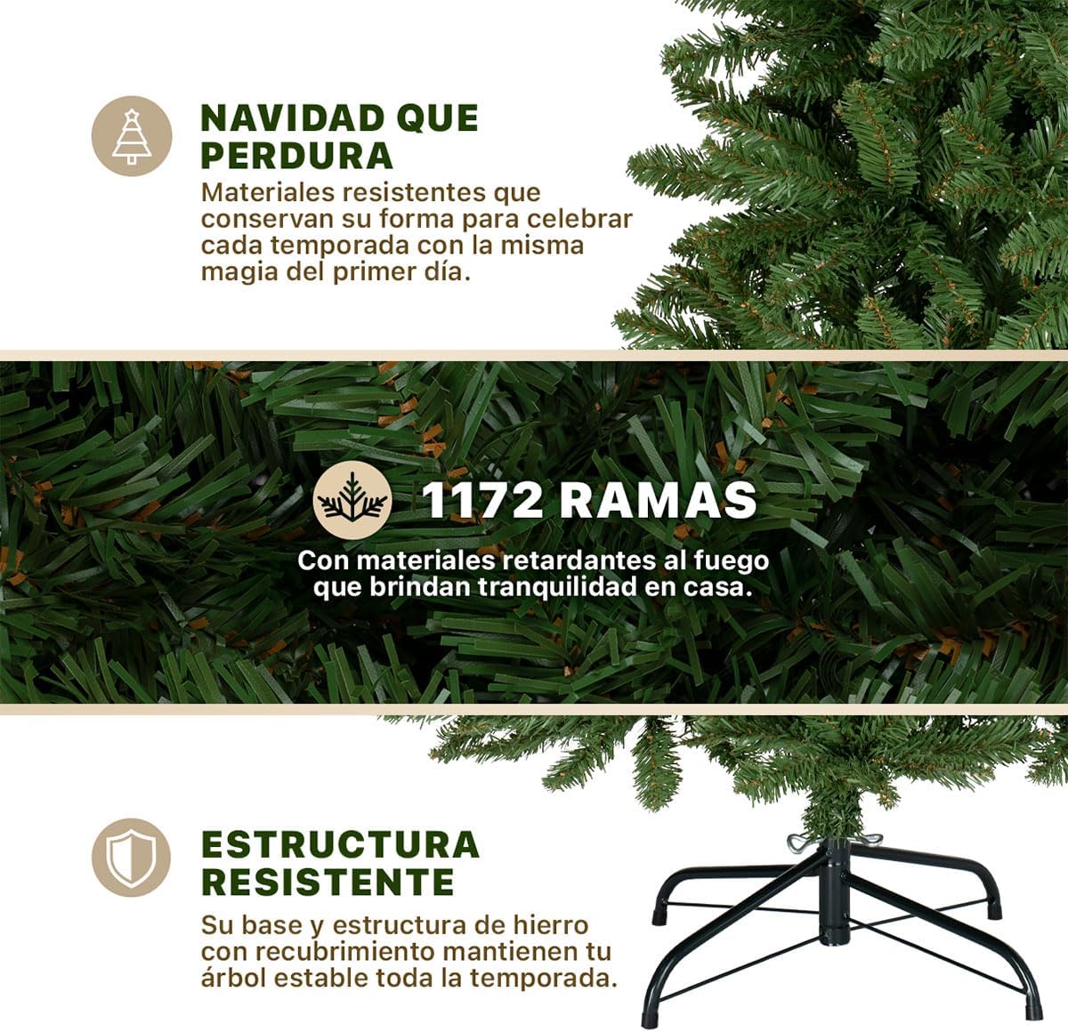 - SISTEMA DE ARMADO FÁCIL: Con un sistema de armado por secciones, nuestros modelos incluyen ramas de despliegue manual o automático por bisagras que permiten una instalación rápida en minutos. Solo abre la base en “X”, embona las secciones y acomoda las ramas para obtener su máximo volumen.