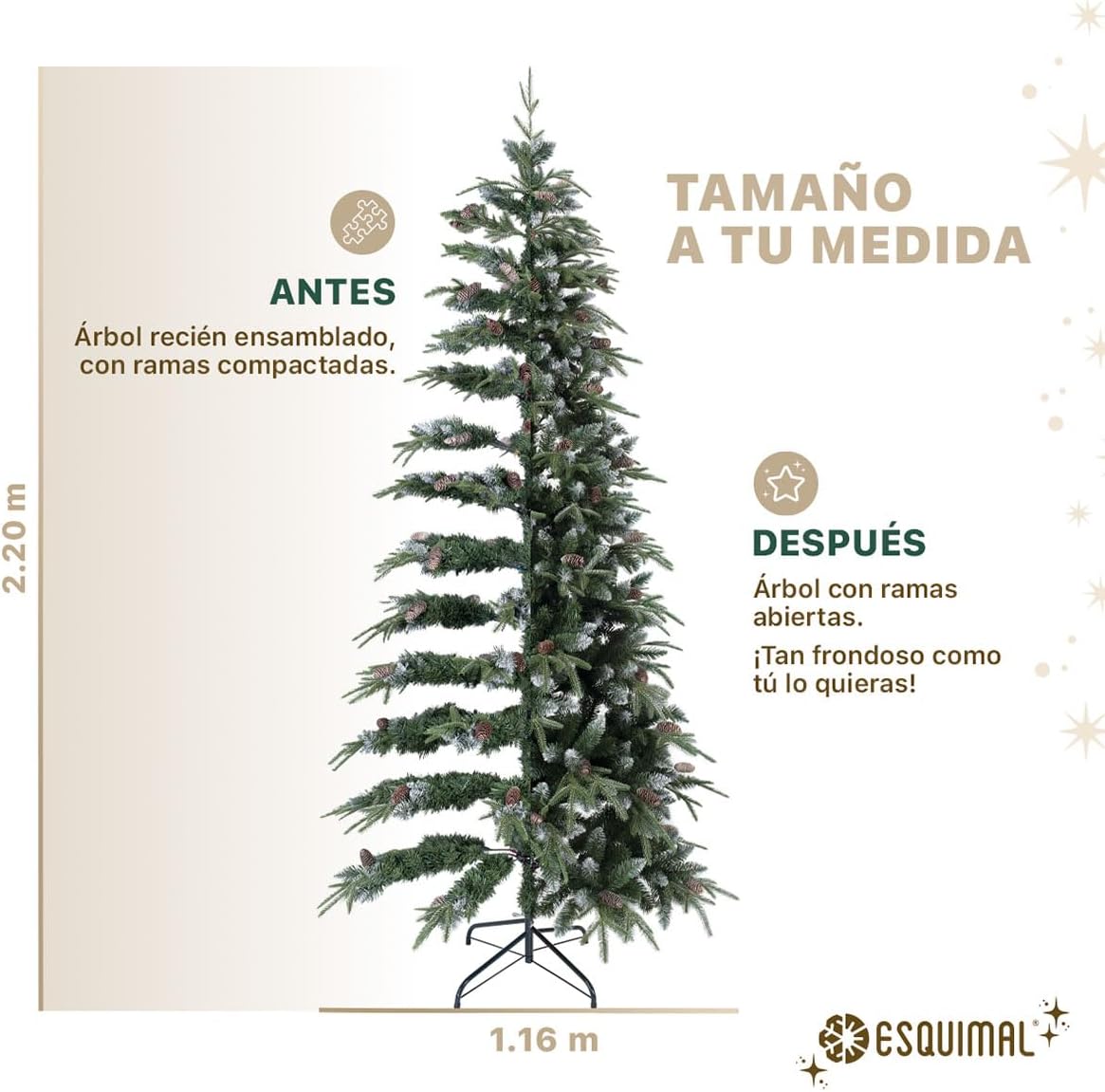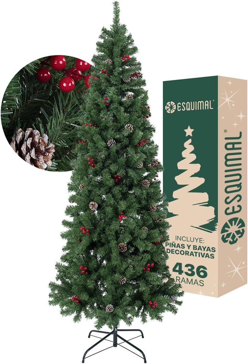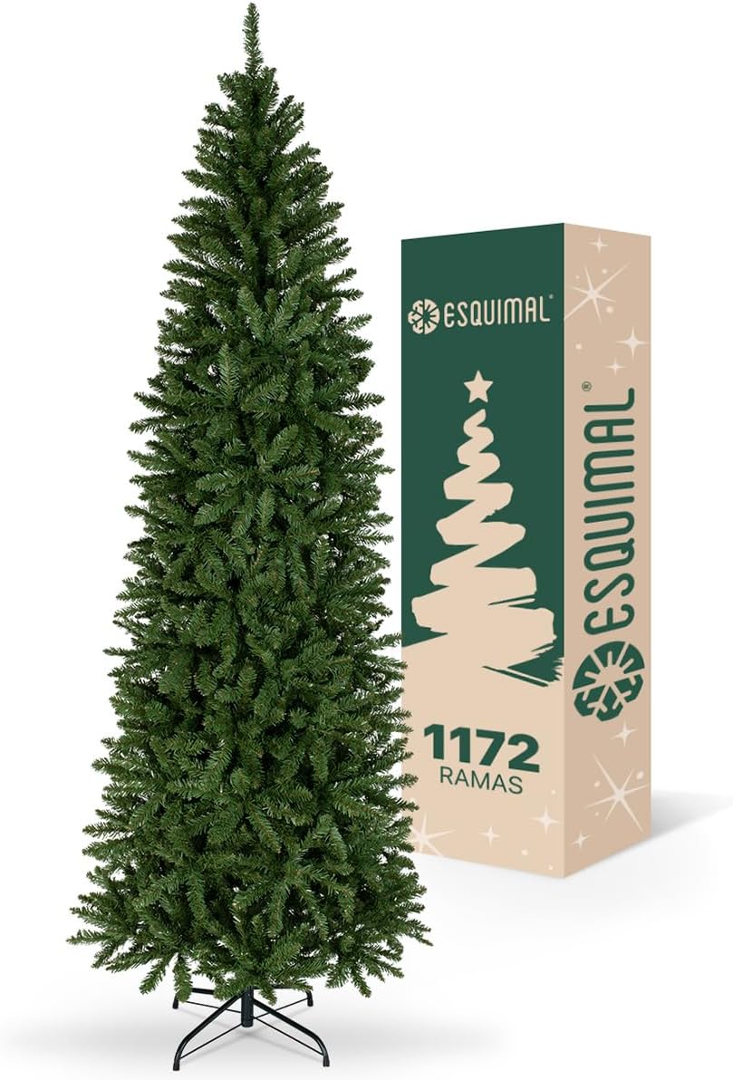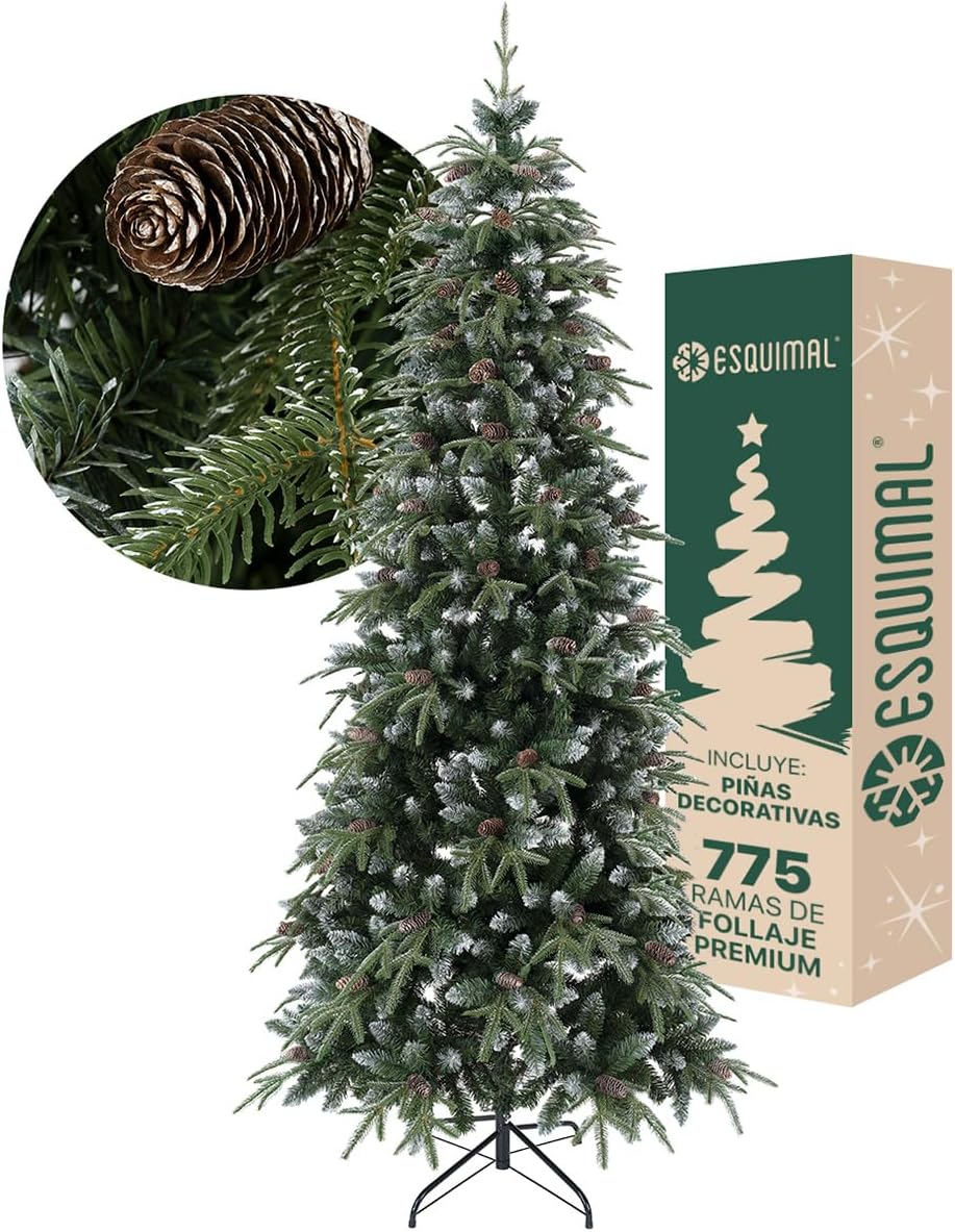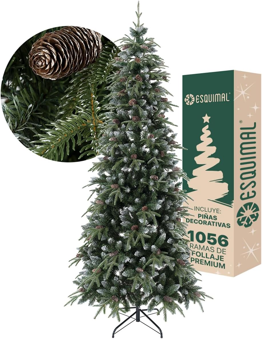 - INCLUYE: 1 Árbol de Navidad Tipo Lápiz con puntas escarchadas, predecorado con piñas, estilo Pino Canadiense frondoso y realista | Tamaño grande: 2.20 x 1.16 m | 1056 ramas mixtas de PVC y PE.