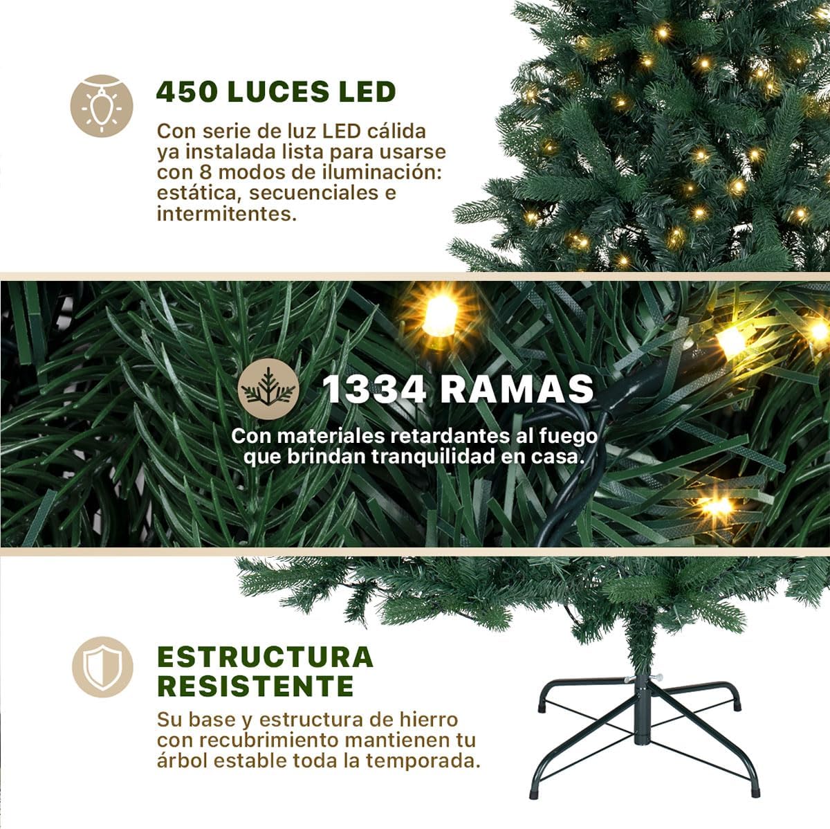 • SISTEMA DE ARMADO AUTOMÁTICO: Diseñado para facilitar el montaje, su armado en secciones con ramas de despliegue por bisagras se instala en pocos minutos. Solo abre la base en forma de “X”, embona las secciones y deja que las ramas caigan naturalmente. Finalmente, acomódalas para lograr el máximo volumen.