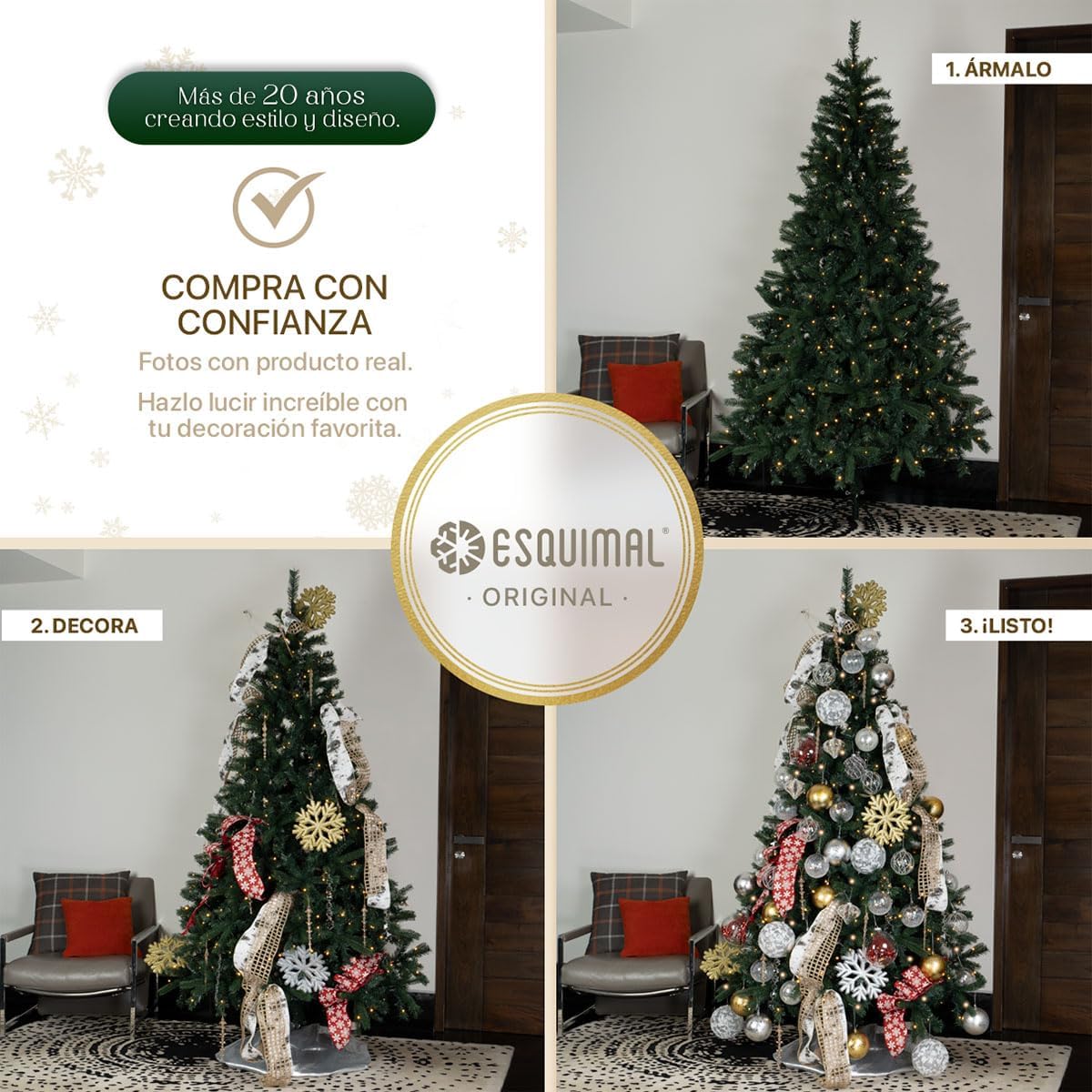 • DECORACIÓN INNOVADORA ESQUIMAL: Con más de 20 años de trayectoria y miles de familias satisfechas, Esquimal es referente de confianza para muchos hogares. Esta temporada invernal, nuestra colección de árboles y decoración navideña continúa acompañandote en la transformación de tus espacios con acabados mejorados y diseños únicos.