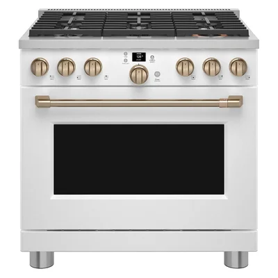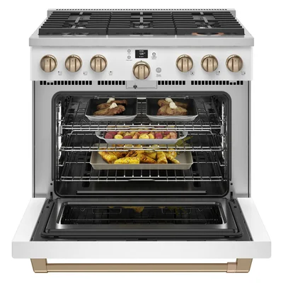Estufa profesional a gas ge café blanca mate 90 cm, 2 quemadores de 15 000 btus para hervir agua en menos tiempo y cocinar más rápido, horno con capacidad de hasta 3 bandejas grandes, meat probe, probeta de temperatura que permite monitorear el horneado y lograr términos perfectos, perillas metalicas + display digital, manija con detalle café, 6 quemadores sellados, encendido electrónico con reignición automática, superficie wika porcenalizada esmalatada, parrillas de fundición con diseño continuo edge to edge, en horno capacidad 6.2 cuft, tecnología de cocción reverse air convection, control del horno: perilla+ display digital , funciones del horno; alarma de precalentado , apagado automático, modo sabbath, retrasar limpieza, timer electónico, sonda de temperatura , autoconversión de recetas, modos de cocción: hornear, asar, fermentar, mantener caliente: hornear con covección, rostizar con convección, sonda de temperatura, limpieza steam clean, iluminación halógena, 3 racks