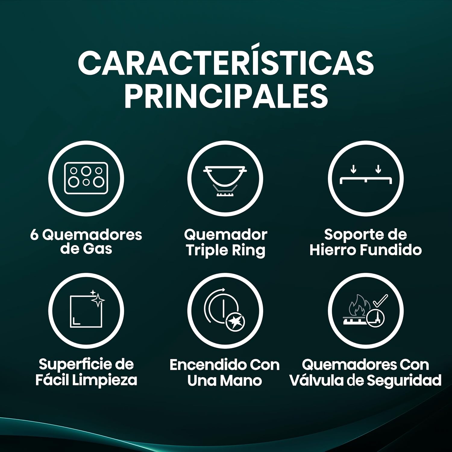 | Característica especial | 2-Wok With 3.0kW, 6 Burners, Cast Iron Pan Support, Easy-clean, Flameout Protection |