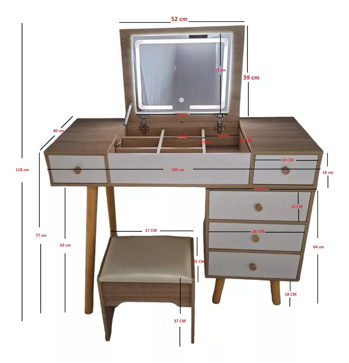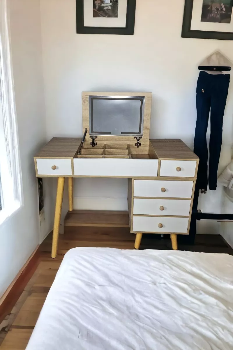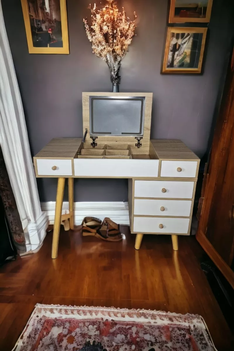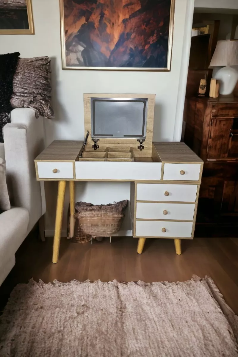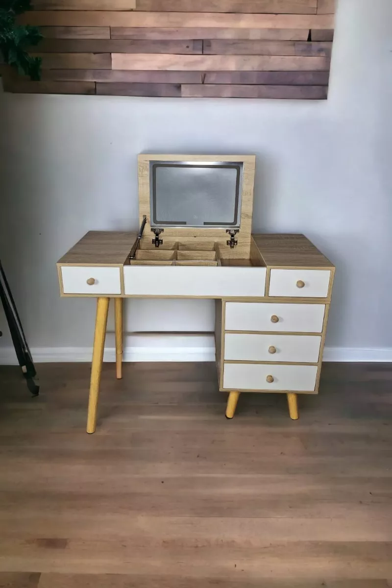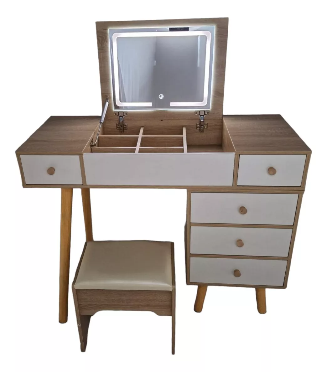 Regalate este precioso y funcional tocador con 3 tipos de luz led, abate el espejo para trabajar en tu lap top o simplemente coloca un adorno para ambientar tu espacio con 6 compartimientos de 17x11 cm mas 1 de 16x36 cm, 3 cajones de 36x13 cm y 2 mas de 18x35 cm.