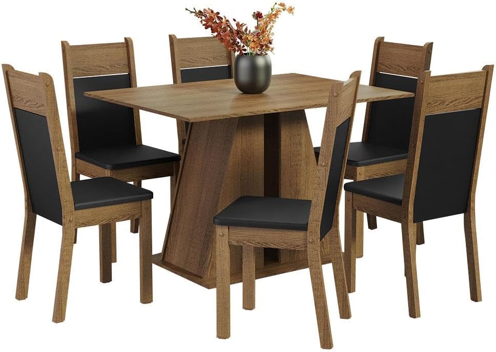 Inspirado en el estilo moderno, combina funcionalidad con diseño elegante gracias a su mesa de pedestal en MDP y capacidad para seis personas. Las sillas, elaboradas en MDF y MDP, cuentan con respaldo ergonómico y asiento tapizado en material sintético negro, fácil de limpiar y adaptable a diferentes decoraciones.
