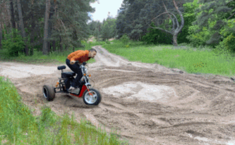 Las principales ventajas de nuestro triciclo son la presencia de dos motores en las ruedas con una potencia máxima total de hasta 40kW, así como una suspensión independiente y un chasis significativamente más resistente.