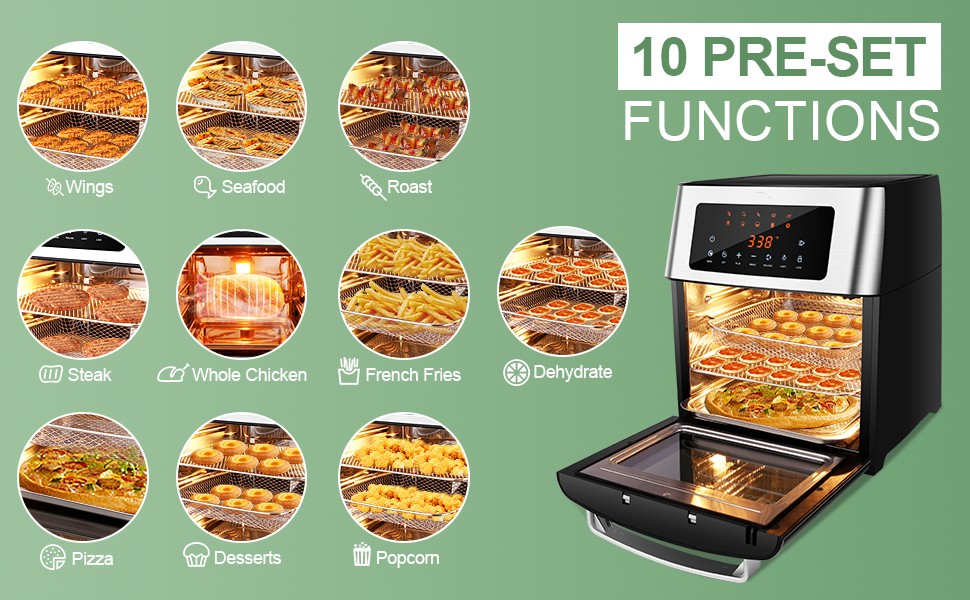 3. Digital screen Comes with 10 built-in smart programs: Wings. Seafood. Grill. Steak. Whole Chicken. French fries. Pizza. Desserts. Popcorn. Dehydrating.