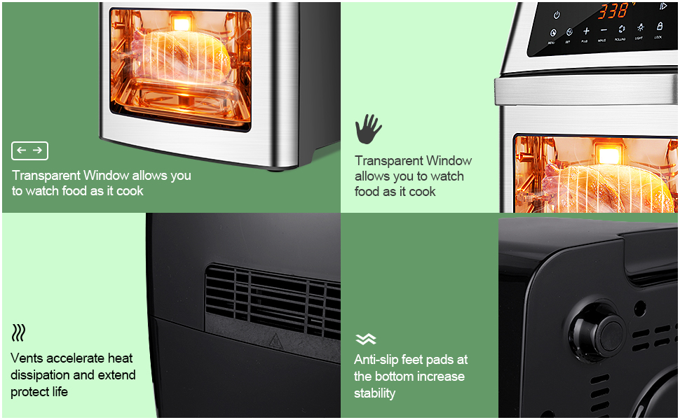 • 🍟【Intuitive LED Digital Touch Screen】- This air fryer oven's simple icons and touch panel make air frying simple. The touch panel contain 10 PRESET MENUS, just tap a preset to automatically set a temperature and time. Setting the 0-59 minutes integrated timer to your desired cooking time. A light control lets you see the progress of the food inside through the 10.6" large visible glass window.