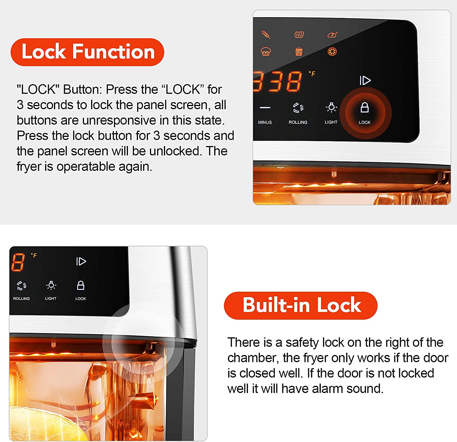 • 🍩【Lock Function & Auto Shut-off】 Equipped with lock function, press the lock button for 3 seconds, the panel will be locked and it can’t be opened until pressing button again for seconds, which prevent children from accidentally. Open the door when the oilless cooker is working, or once the preset time ends, the fryer will automatically shut off prevents overcooking and overheating.