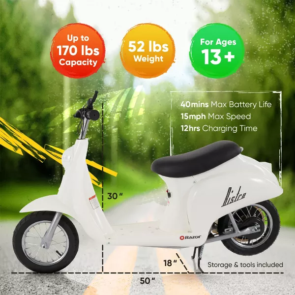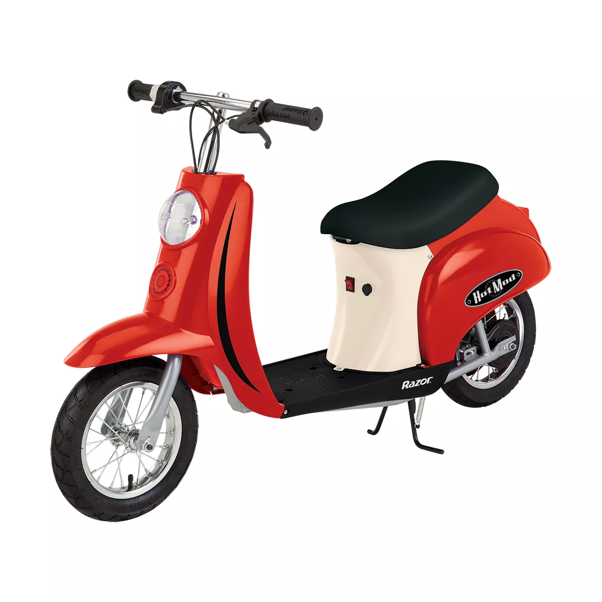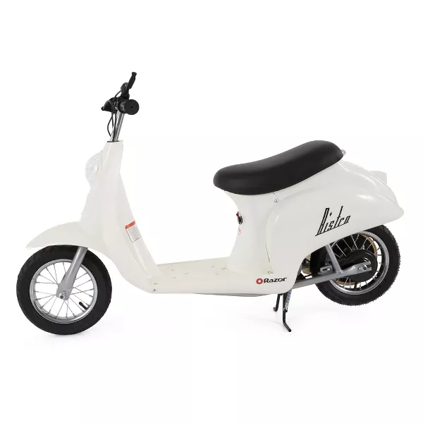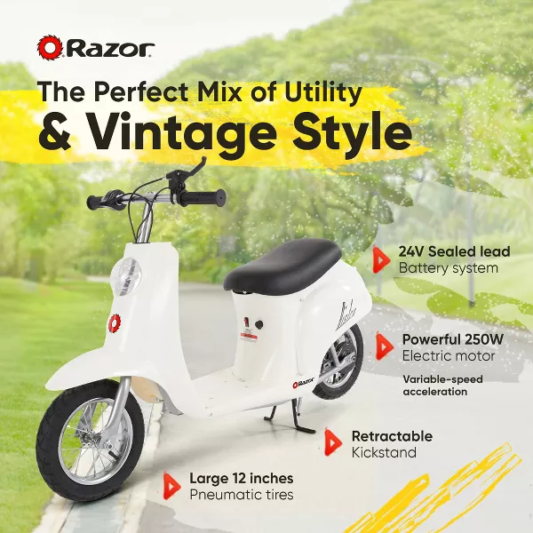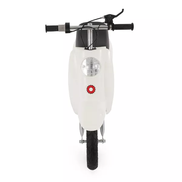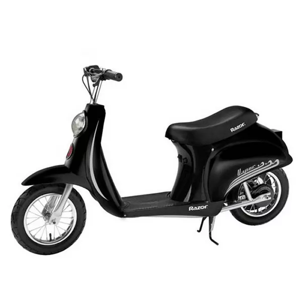 If your child has a need for speed (no worries, only up to 15 mph), then this white Razor Pocket Mod Miniature Electric Scooter will give your child a thrill ride. The Razor Pocket Mod gives every kid with an eye for style and passion for fun a set of wheels that is sure to be the hottest accessory on the block. Vintage-inspired styling meets high performance with the classic Italian scooter design. Featuring a high-performance, chain-driven electric motor, the Razor Pocket Mod can travel up to 10 miles before re-charging and reach speeds of up to 15 miles per hour-plenty fast for a quick trip around the block or a fun ride to the park. The scooter shows off a pair of 12-inch pneumatic tires with a rear suspension system to ensure a comfortable ride. Vroom vroom! Watch out, this white Razor Pocket Mod Miniature Electric Scooter is coming in hot (remember, only 15 mph). Your child will ride around lookin' fly and catching a nice breeze on their back.w99