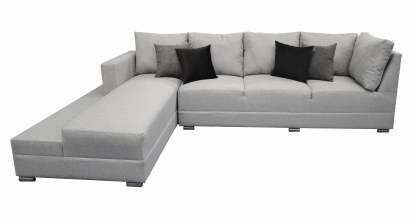 • Tapizada en fina tela lino en color gris oxford. Acojinamiento con hule espuma de alta densidad y delcron greña en cojines, para mayor confort y durabilidad.