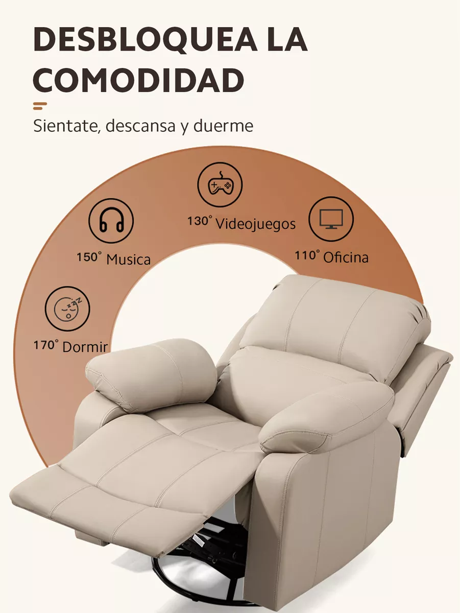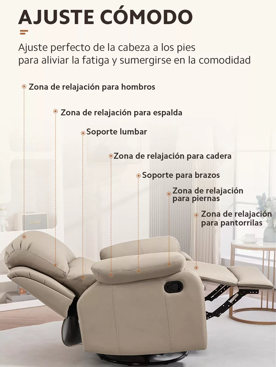 ¡Prepárate para una experiencia de relax incomparable! Este sillón ofrece una rotación completa de 360°, un suave balanceo de 30° y una reclinación ajustable de 90° a 150°. Con una simple palanca junto al reposabrazos, podrás ajustar tanto el respaldo como el reposapiés para encontrar tu posición ideal. Además, cuenta con un práctico soporte para celular que te permitirá tener las manos libres mientras disfrutas de un descanso total.