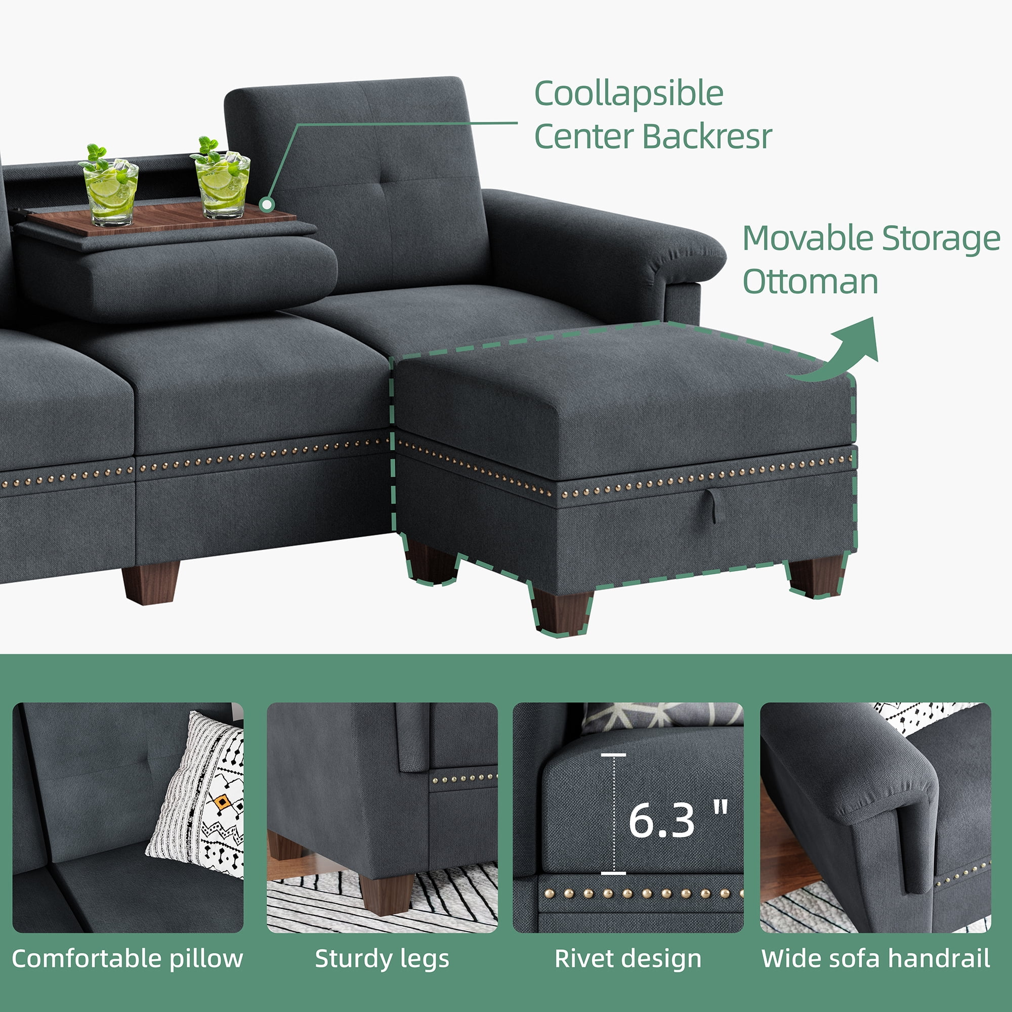 【Sofá cómodo y resistente】Fabricado con una estructura de madera maciza que le aporta robustez y estabilidad para un uso prolongado. El sofá seccional está fabricado con tela de lino de alta calidad, cómoda y transpirable. Su espuma de alta elasticidad proporciona un buen soporte para el cuerpo, ya sea en la sala, el apartamento o la oficina. Este sofá reclinable es el complemento perfecto.