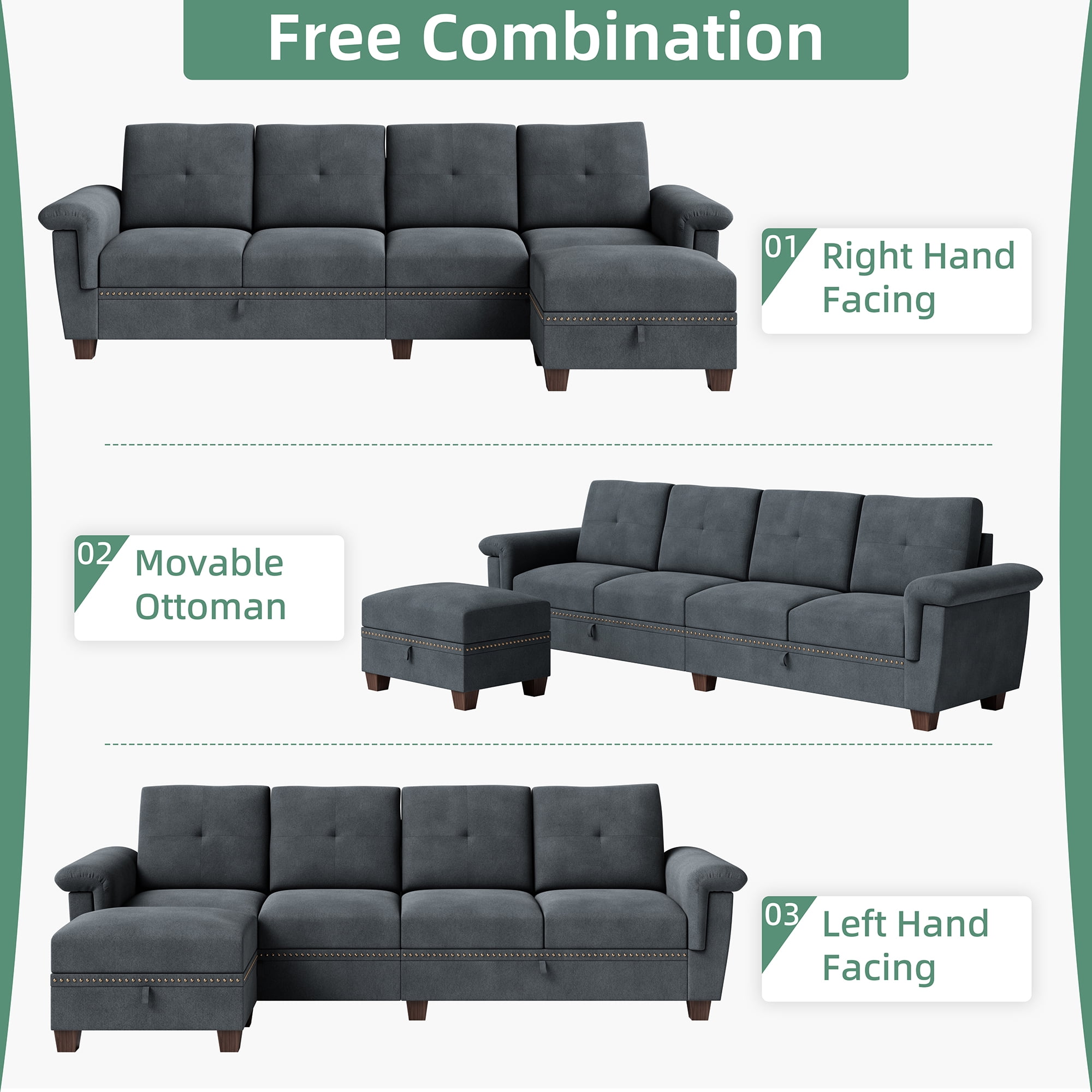 【Sofá seccional moderno】Este conjunto de sofá seccional es lo suficientemente compacto como para caber en su sala, apartamento y más, a la vez que ofrece un amplio espacio para sentarse. Nuestro sofá seccional con diseño de remaches es elegante y combina fácilmente con cualquier estilo. Fácil montaje: Dimensiones: 76 cm de profundidad x 274 cm de ancho x 90 cm de alto. Incluye instrucciones detalladas y todas las herramientas necesarias para facilitar el montaje. Si tienes algún problema, no dudes en contactarnos.