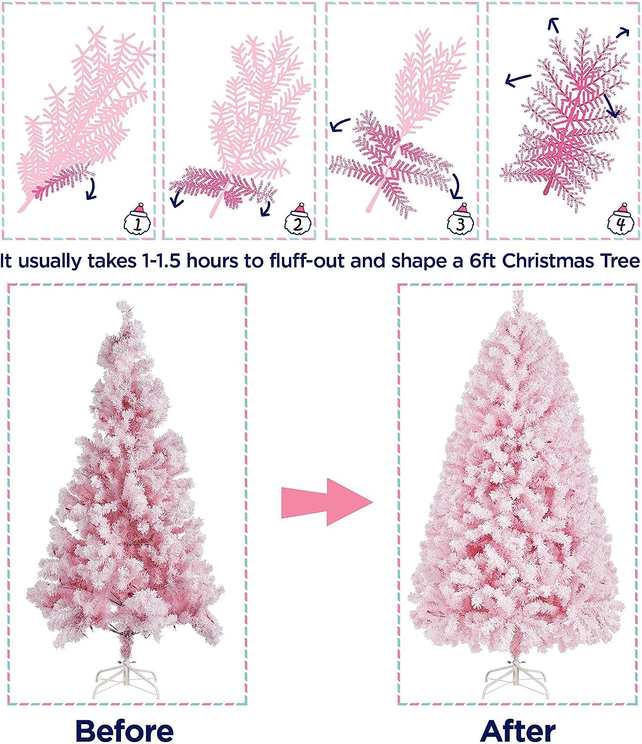 • Sobre el montaje: el cuerpo del árbol se divide en 3 secciones con etiquetas en ellos. Puedes insertar una parte en otra. Las luces están prefijadas en el cuerpo del árbol sin necesidad de ponerlas y asentarlas. El soporte también se puede conectar sin esfuerzo al cuerpo del árbol con tornillos.