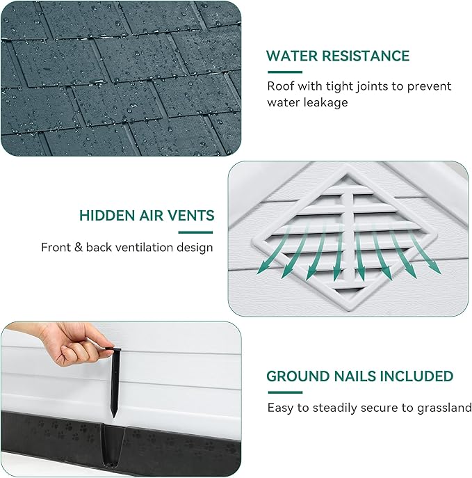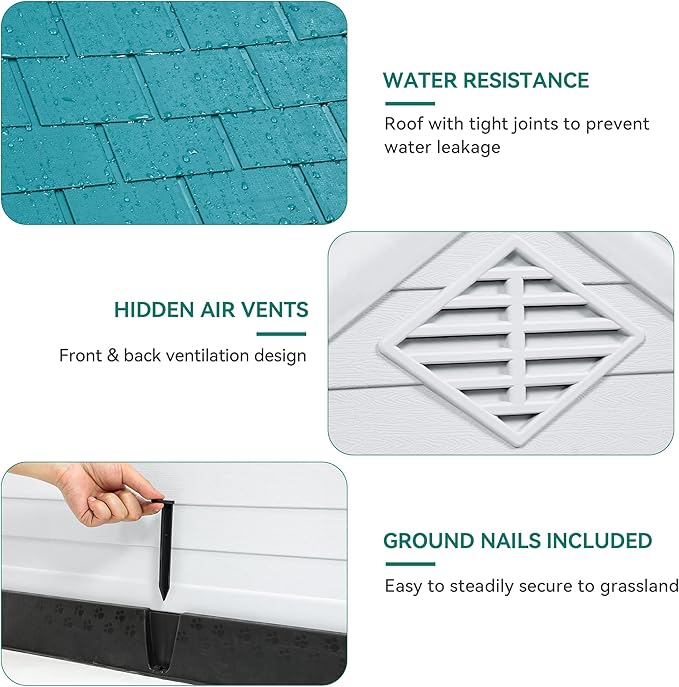 - Estructura resistente a la intemperie: diseño protector sellado, base alta de 3.1 pulgadas junto con techo inclinado que armonizan para resistir la suciedad, la lluvia, la nieve y otros elementos climáticos; nuestra casa para perros al aire libre también tiene 2 clavos de tierra para garantizar la estabilidad durante vientos fuertes.