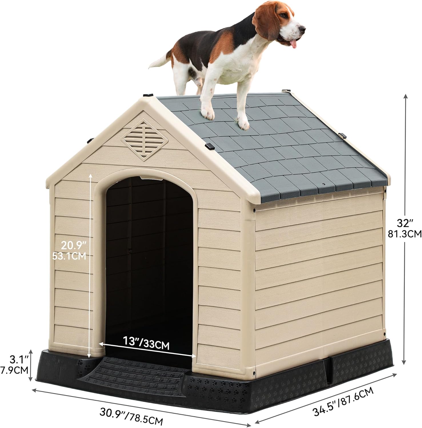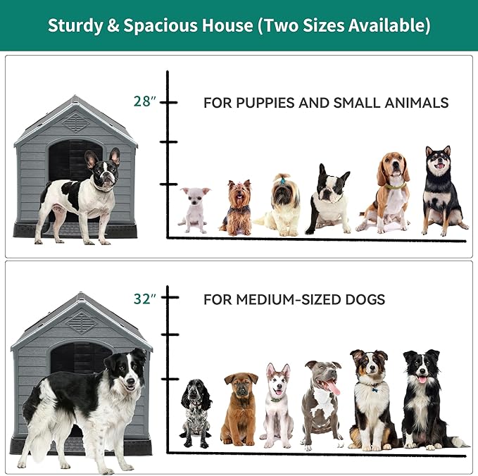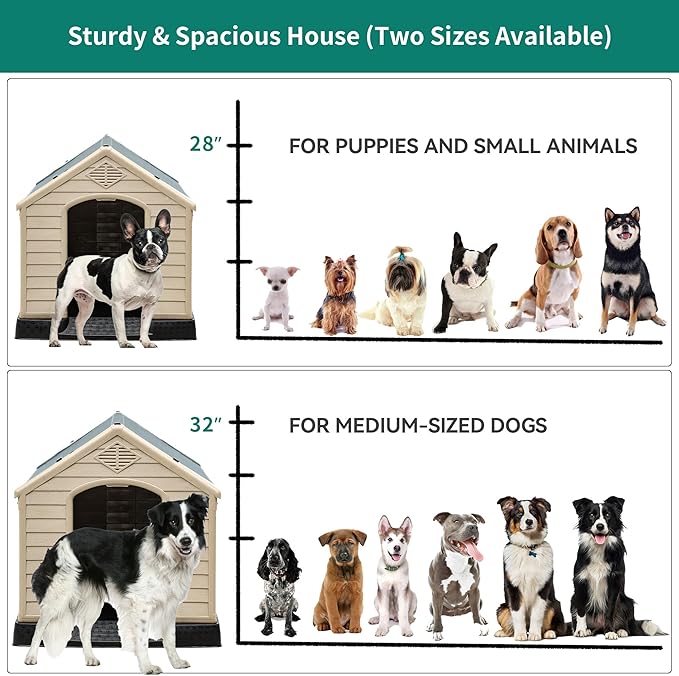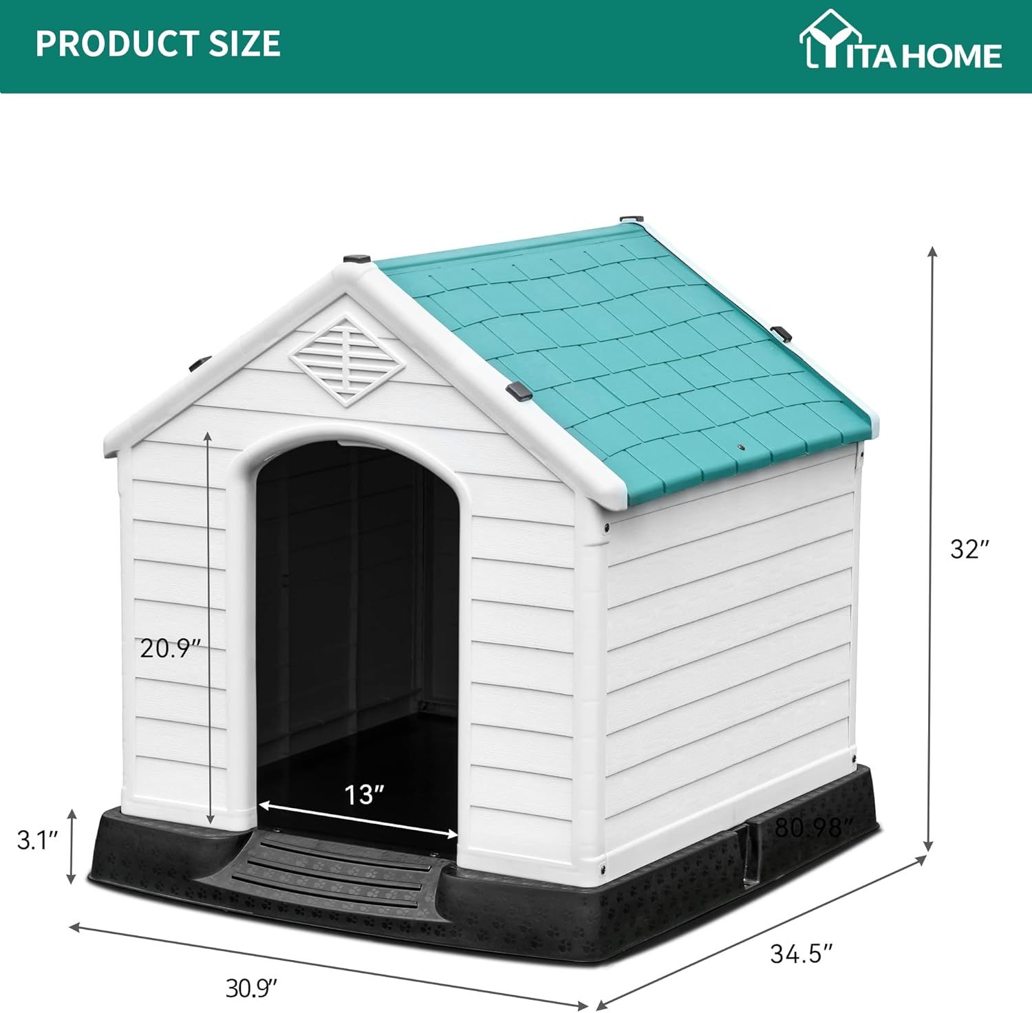 - Casa para perros de tamaño pequeño y mediano: esta casa de plástico para perros cuenta con dimensiones generales de 34.5 pulgadas de largo x 30.9 pulgadas de ancho x 32 pulgadas de alto y una puerta de 13 x 20.9 pulgadas, proporcionando una espaciosa habitación para mascotas y perros como Pomerania, Bulldog francés, Teddy, etc.