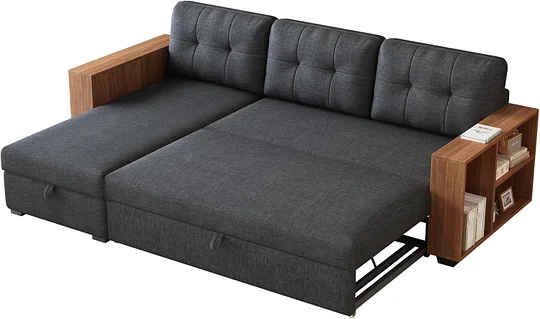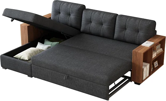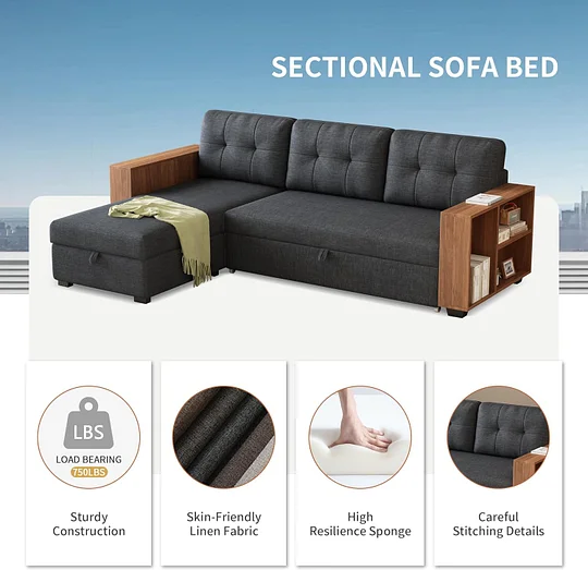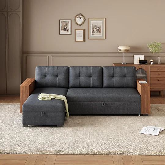 Sofá cama convertible seccional en forma de L con tumbona de almacenamiento y 2 reposabrazos de madera para gabinete