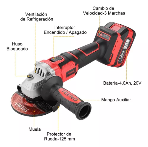 Amoladora angular sin escobillas La amoladora angular TEENO tiene una velocidad de hasta 9800 RPM, lo que brinda un procesamiento eficiente para aplicaciones profesionales de corte y amolado. Además, el innovador diseño de ventilación ayuda a evitar el polvo y la suciedad para un mejor rendimiento.