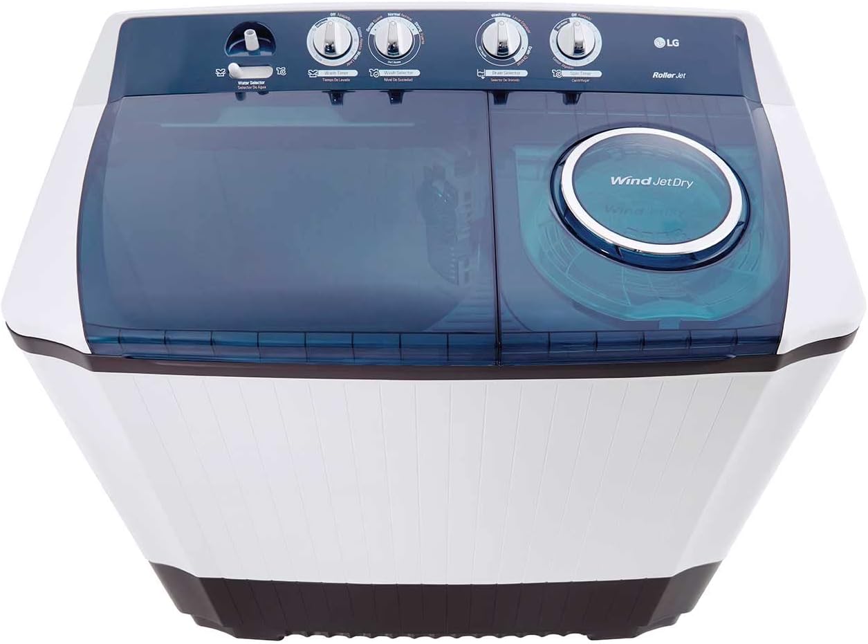 LG la lavadora de 2 tinas lg wp18war tiene una capacidad de lavado de 18 kilos y hasta 10 kilos de centrifugado, su sistema de lavado por pulsador de alta eficiencia genera múltiples corrientes de agua garantizando un lavado profundo, eliminando las manchas difíciles y lo mejor, sin dañar tus prendas, posee 3 niveles de intensidad de lavado, filtro atrapa pelusas removible que deja aún más limpia tu ropa, tecnología wind-jet-dry que brinda un mejor proceso en el centrifugado retirando la humedad con mayor eficiencia y obteniendo ropa más seca, reloj de lavado de 15 minutos, obturador de drenado, switch de seguridad en la tina de centrifugado y selector de válvula para lavar o centrifugar. su tina de plástico ofrece gran durabilidad, tiene panel de control con perillas ergonómicas muy fácil de usar y un diseño compacto ideal para habitaciones o casas pequeñas.