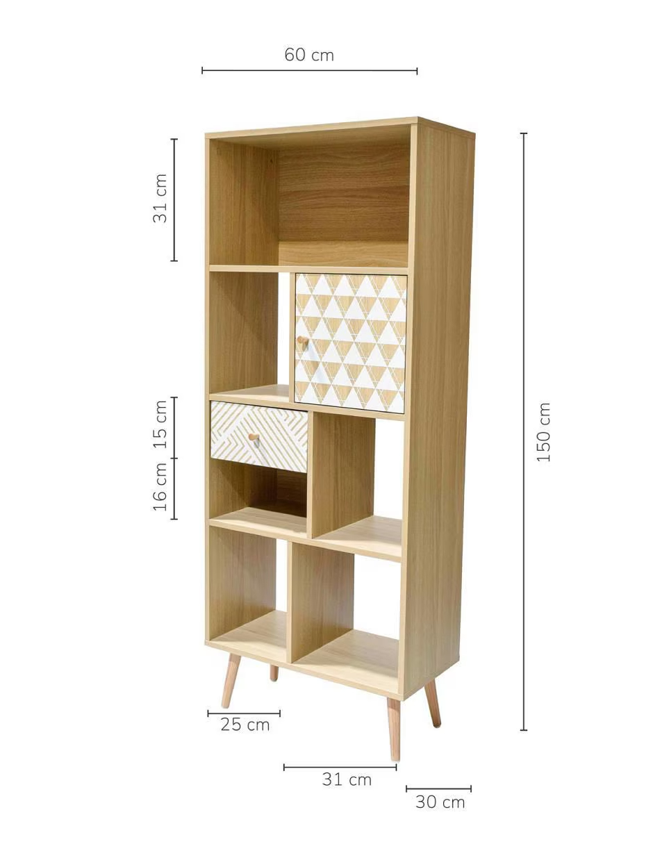 Disfruta de práctico y moderno librero, ideal para optimizar tus espacios. Con cubierta lisa café claro y detalles geométricos color blanco. Cuenta con amplios entrepaños, puerta y cajón.