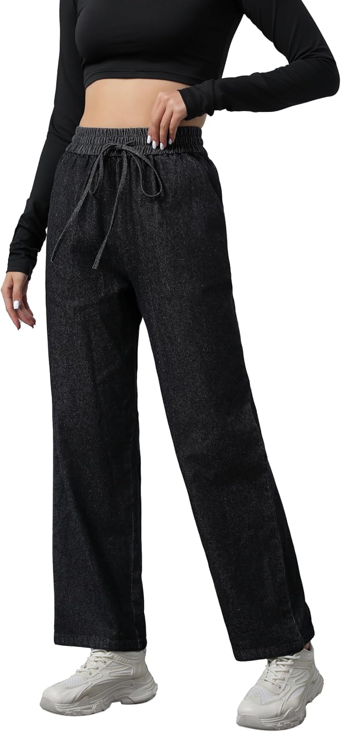 Con una cintura fruncida de alta elasticidad con un cordón ajustable, bolsillos laterales profundos en tela a juego y puños de mezclilla de pierna ancha, estos pantalones ofrecen comodidad, practicidad y un aspecto elegante. Perfecto para el uso diario.