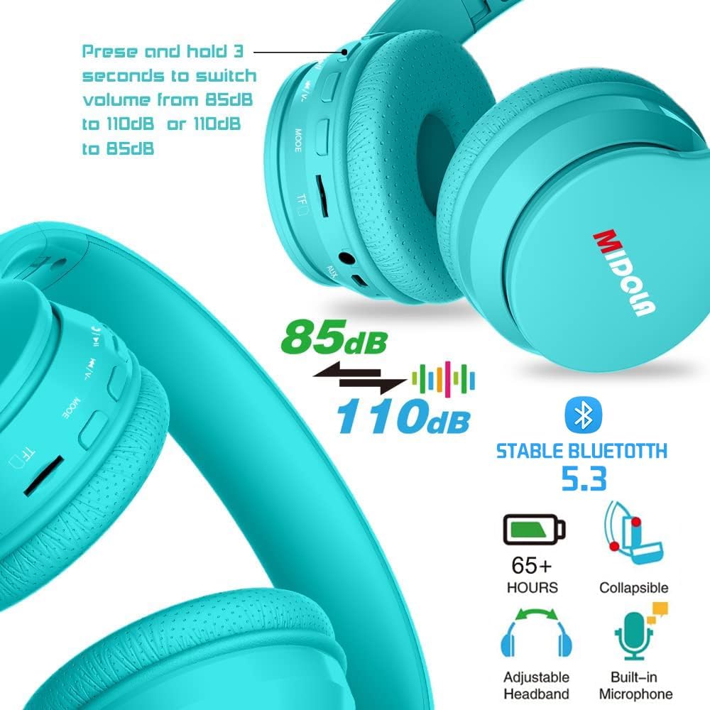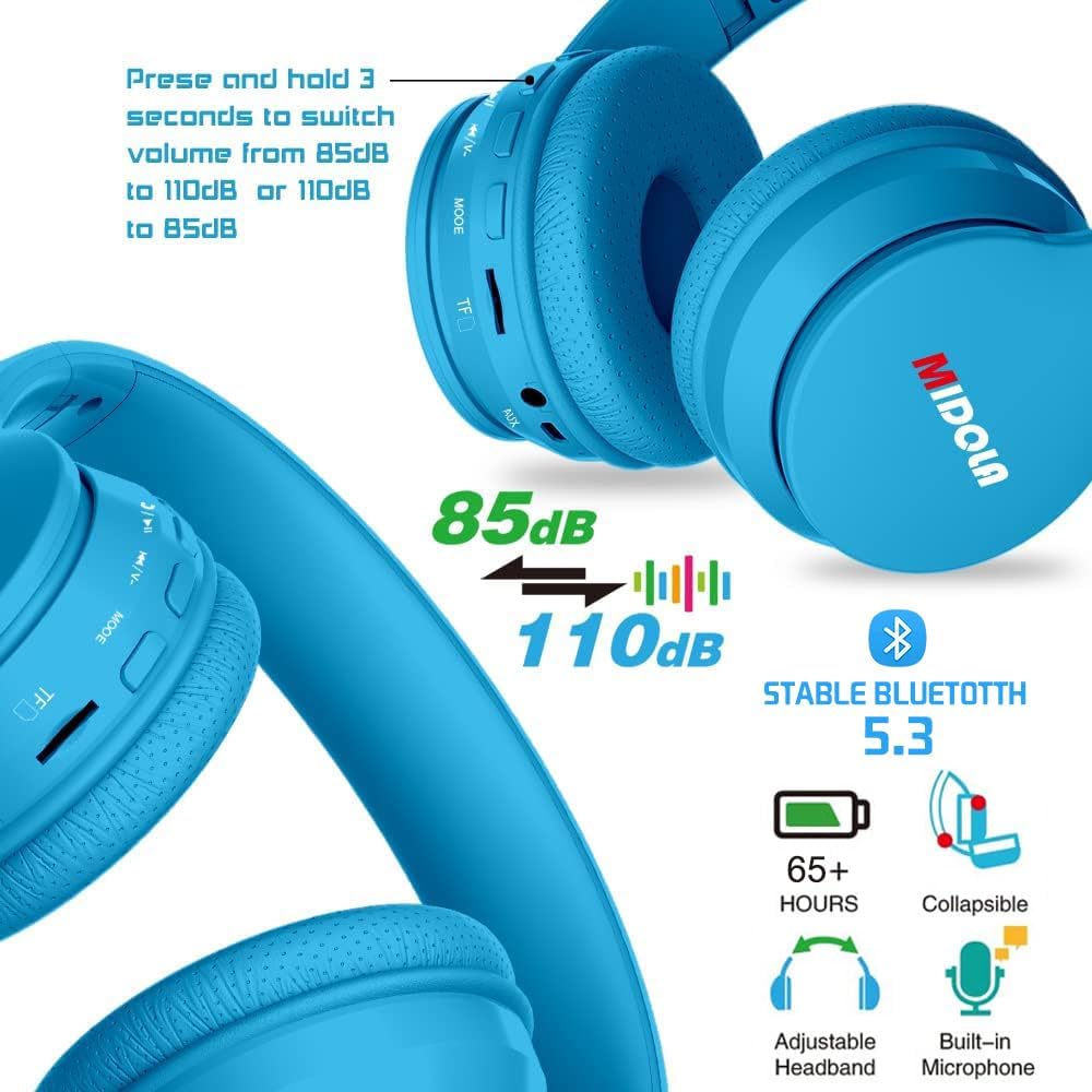 • (Interruptor de 85 dB: niños a 110 dB: Aldult) Protección auditiva: Midola Kids (edad 2 años+) Los auriculares protegen a tus hijos de lesiones auditivas cuando juegan durante mucho tiempo con 85 dB de volumen limitado (el nivel que la Organización Mundial de la Salud considera más seguro). El volumen se puede cambiar de 85 dB (niños) a 110 dB (Aldult) cuando presionas y mantén pulsado el botón de pausa/reproducción 3 segundos.