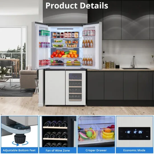 Refrigerador de puerta francesa Adoolla de 21 pies cúbicos, congelador inferior con gabinete para vinos, estantes de vidrio ajustables, refrigerador de cocina de 4 puertas en acero inoxidable, plateado detalles 0