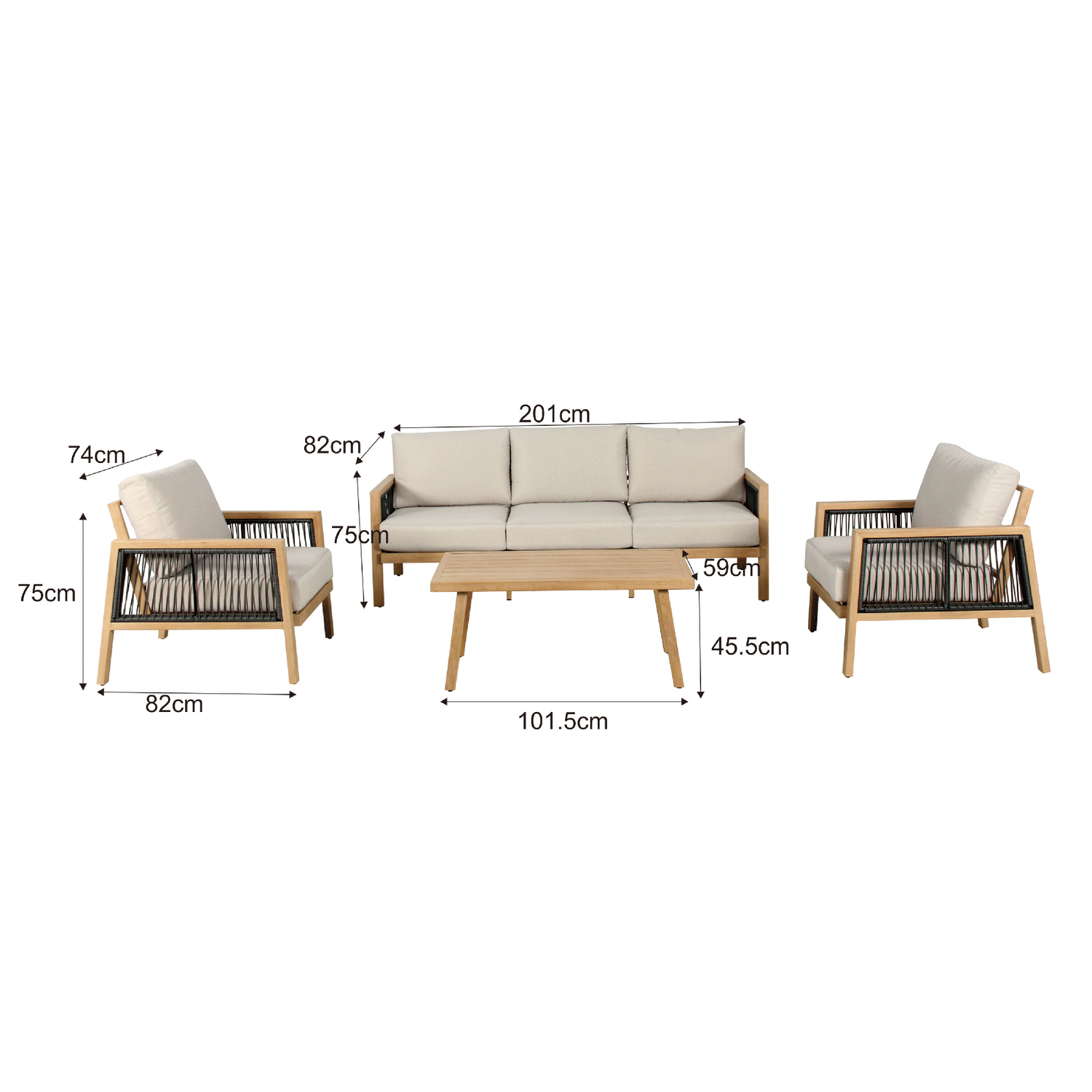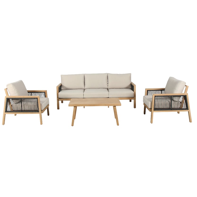 El juego de terraza Andalucía 5 personas es ideal para disfrutar de momentos especiales al aire libre. Cuenta con un sofá de 201x81x76 cm, dos poltronas de 74x81x76 cm y una mesa de 101,5x59x46,5 cm. El juego está hecho de aluminio y tiene un color beige. Además, incluye apoyabrazos y es fácil de armar. El juego no es plegable ni cuenta con ruedas.