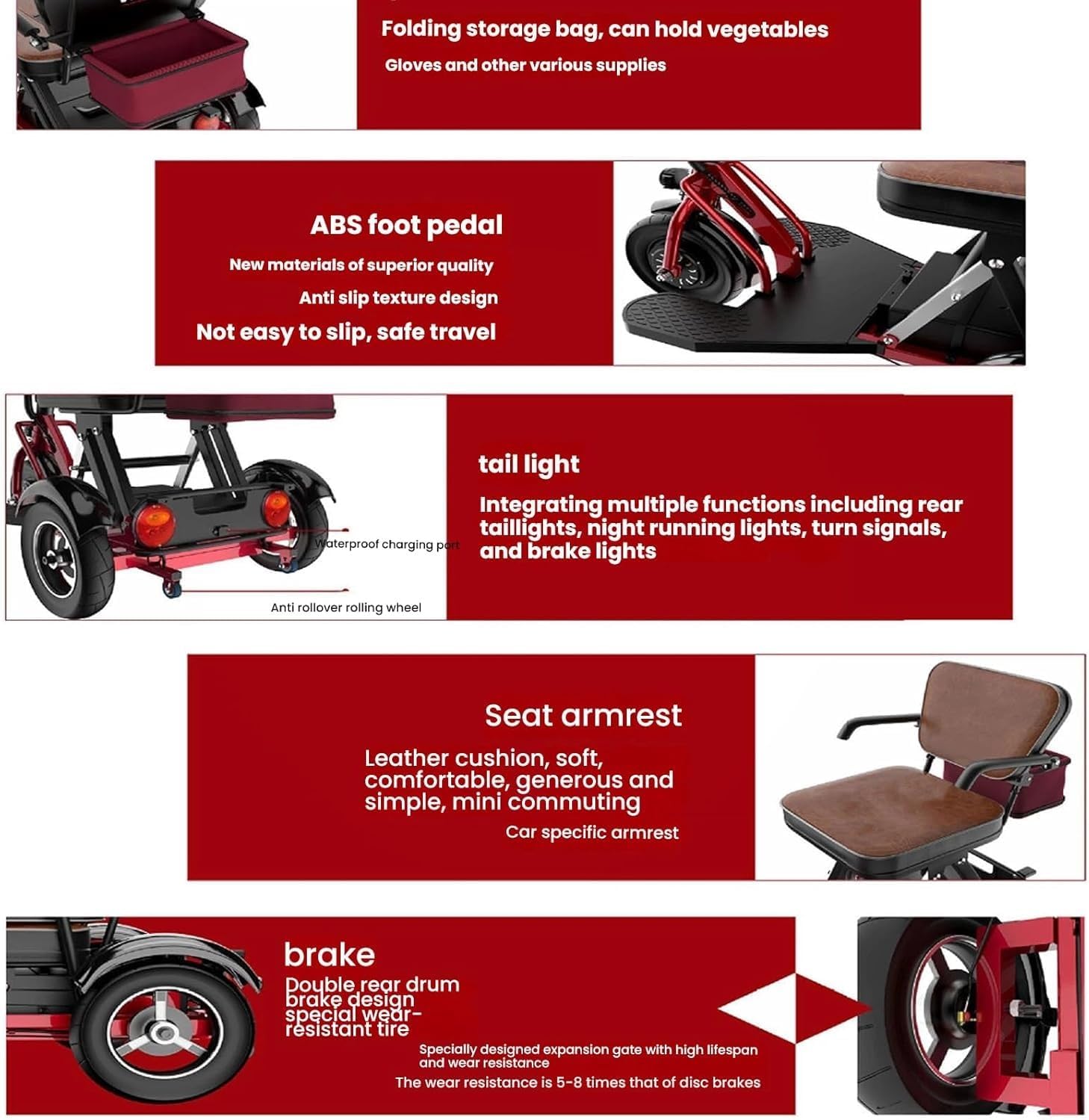 - 1. ESTABILIDAD: Las tres ruedas de este triciclo eléctrico mejoran considerablemente la estabilidad incluso en terrenos exteriores más irregulares, como céspedes y playas. Este triciclo también cuenta con un diseño de iluminación que facilita a las personas con discapacidad y a los ancianos subir y bajar del vehículo.