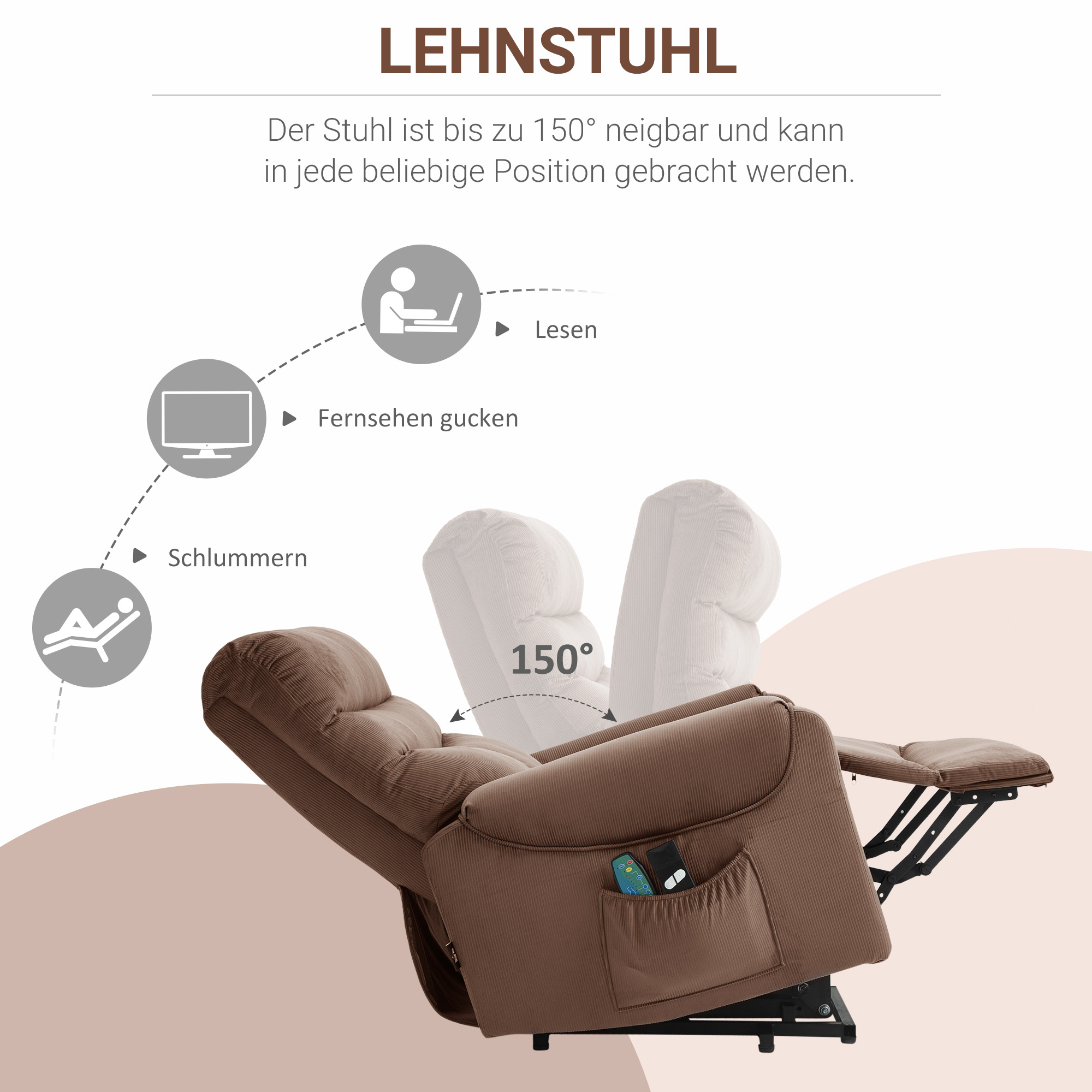Sillón TV con asistencia eléctrica de elevación, sillón de masaje con función reclinable y función de calor, sillón de relajación con control remoto y bolsillo lateral, tela de poliéster marrón ajustable