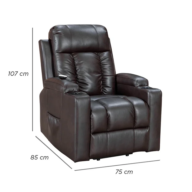 Este sillón elevador en cuero negro combina líneas modernas con un acolchado generoso que invita al descanso. Su tapizado en piel sintética de alta calidad ofrece un acabado sofisticado, resistente y fácil de limpiar, ideal tanto para salas contemporáneas como para rincones de entretenimiento. Los amplios reposabrazos y su estructura envolvente brindan una sensación de abrazo al sentarse, mientras que el bolsillo lateral integrado aporta funcionalidad sin perder estilo.