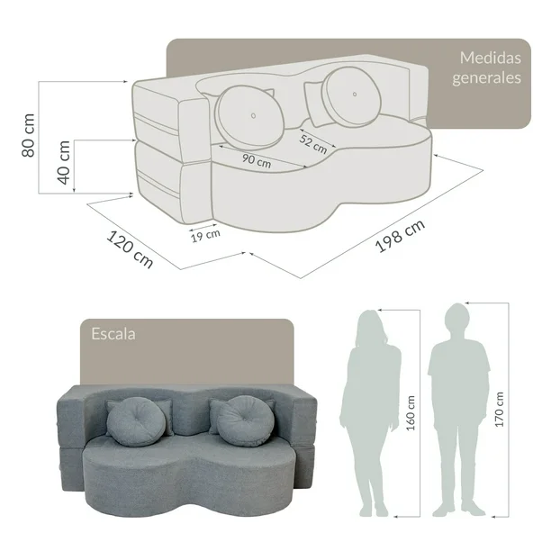 TAMAÑO: Sofá: 198*120*80 cm Peso bruto: 50 kg DIFERENTES CONFIGURACIONES: Sofá / Cama MATERIALES: 100% poliéster. Tejido de pana. Espuma de alta densidad y alto rebote diseñada específicamente para la compresión. Algodón suave y ecológico. CARACTERÍSTICAS: Embalaje de compresión al vacío para evitar la entrada de polvo durante el transporte. Tejido agradable para la piel, tacto lujoso. Diseño completamente desmontable y lavable. Cojín de espuma de alta densidad, fuerte soporte. Diseño minimalista clásico, estilo versátil. Sin marco de madera, seguro y sin preocupaciones.