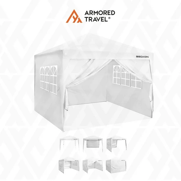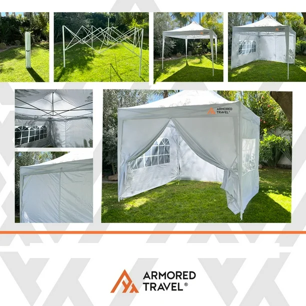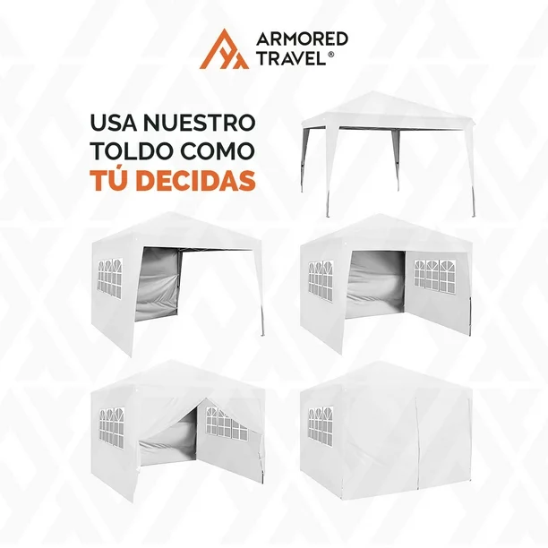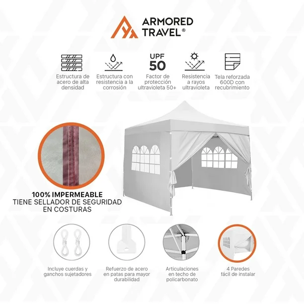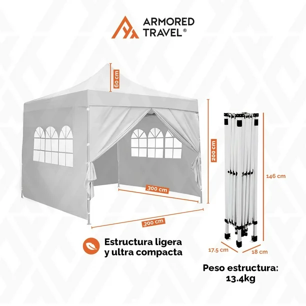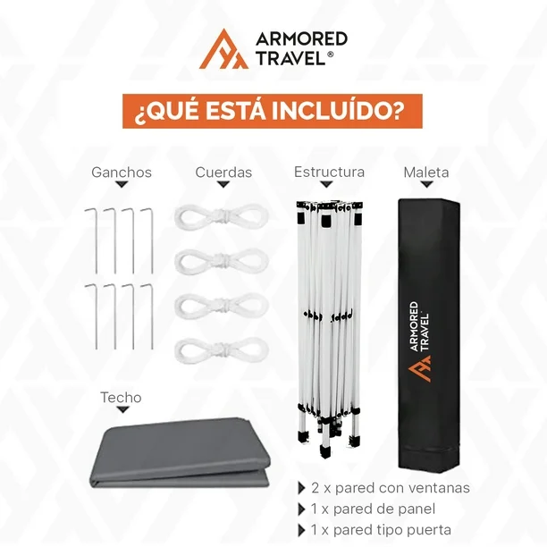 Lona para techo: 100% poliéster 600D con recubrimiento.$$ Lona para pared con ventanas.$$Incluye maleta, kit de estacas y tensores.$$Base de Acero reforzado.$$ Brinda portabilidad y fácil manejo.