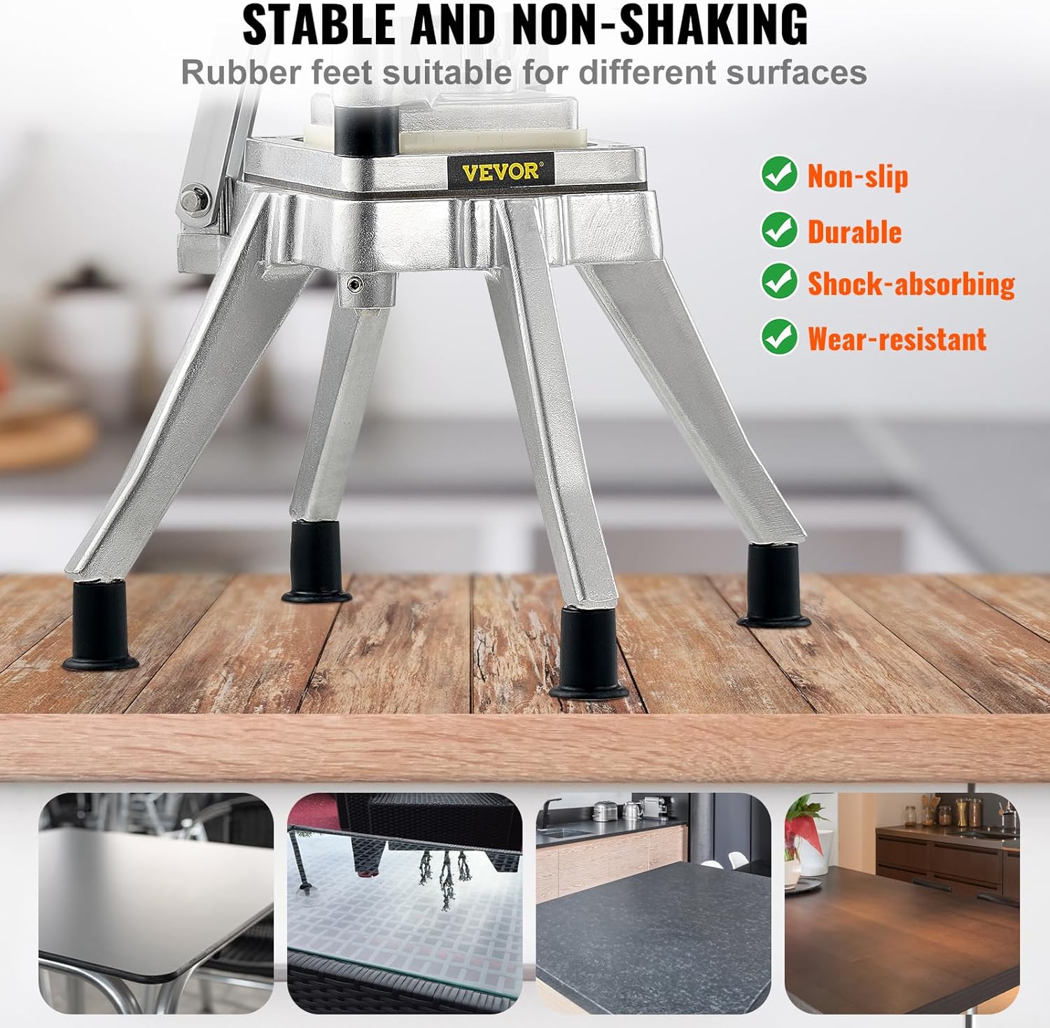 - Buena estabilidad y fácil limpieza: los cuatro pies antideslizantes del dicer de patatas son resistentes al desgaste, sólidos, amortiguadores, antideslizantes e inodoros, lo que garantiza estabilidad y rendimiento durante el funcionamiento. Las cuchillas y el bloque de empuje son extraíbles y lavables, fáciles de limpiar y mantener.