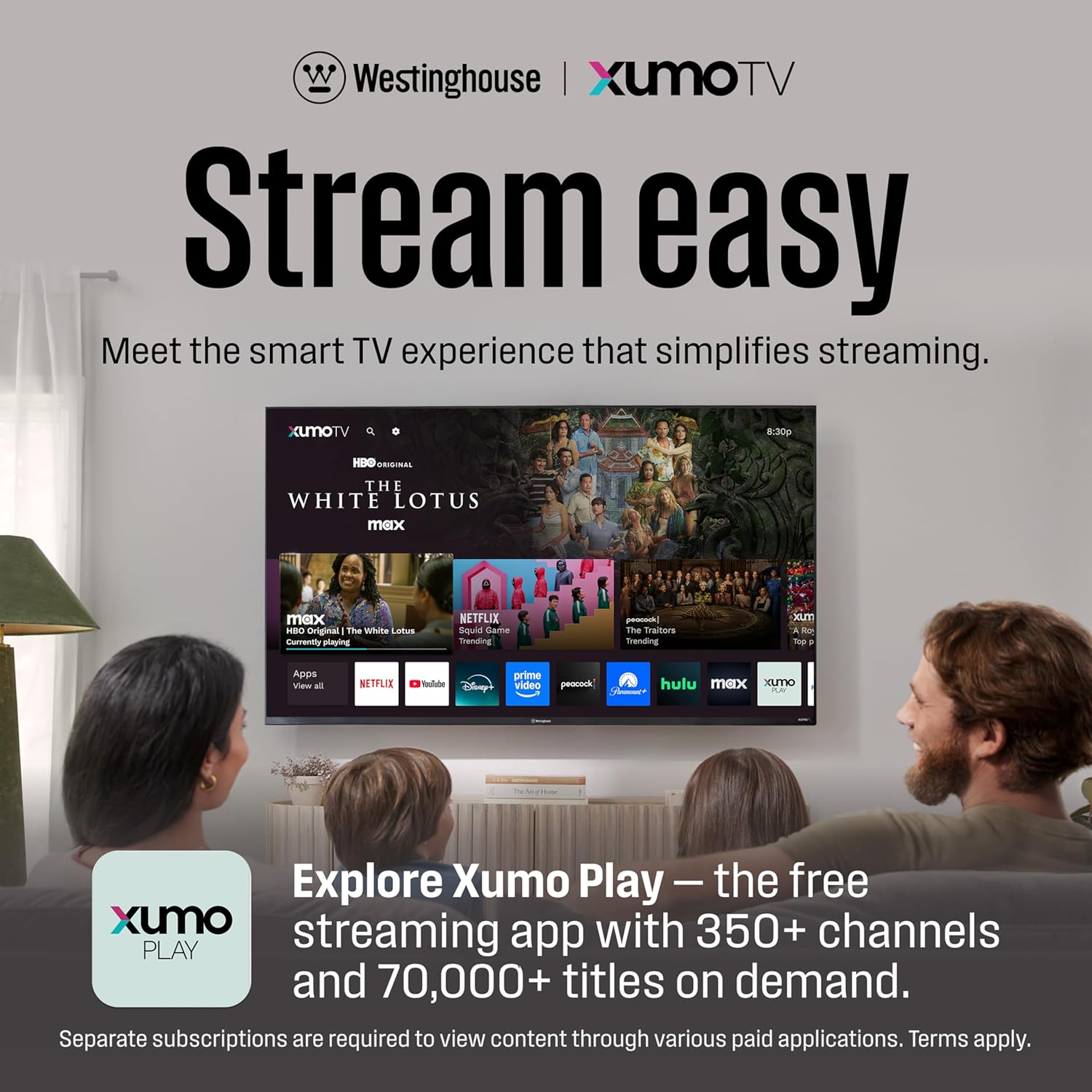 • Entretenimiento infinito - Transmite fácilmente con acceso instantáneo a las mejores aplicaciones como Netflix, Prime Video, Disney+, Apple TV+, Hulu, HBO MAX, ESPN+, YouTube TV y mucho más, todo en un solo lugar. La aplicación Xumo Play incluye más de 350 canales en vivo gratuitos y más de 70 000 películas y programas a la carta en deportes, noticias, entretenimiento y mucho más. No se requieren suscripciones ni descargas, simplemente inicia y comienza a transmitir.