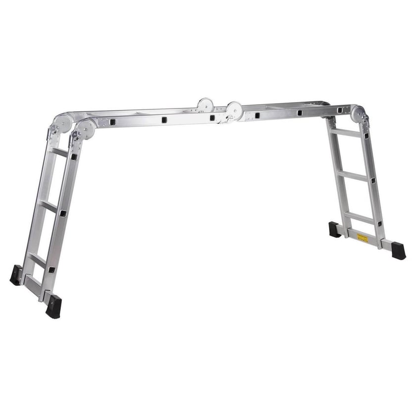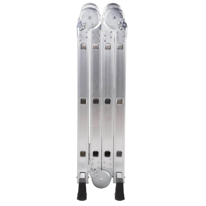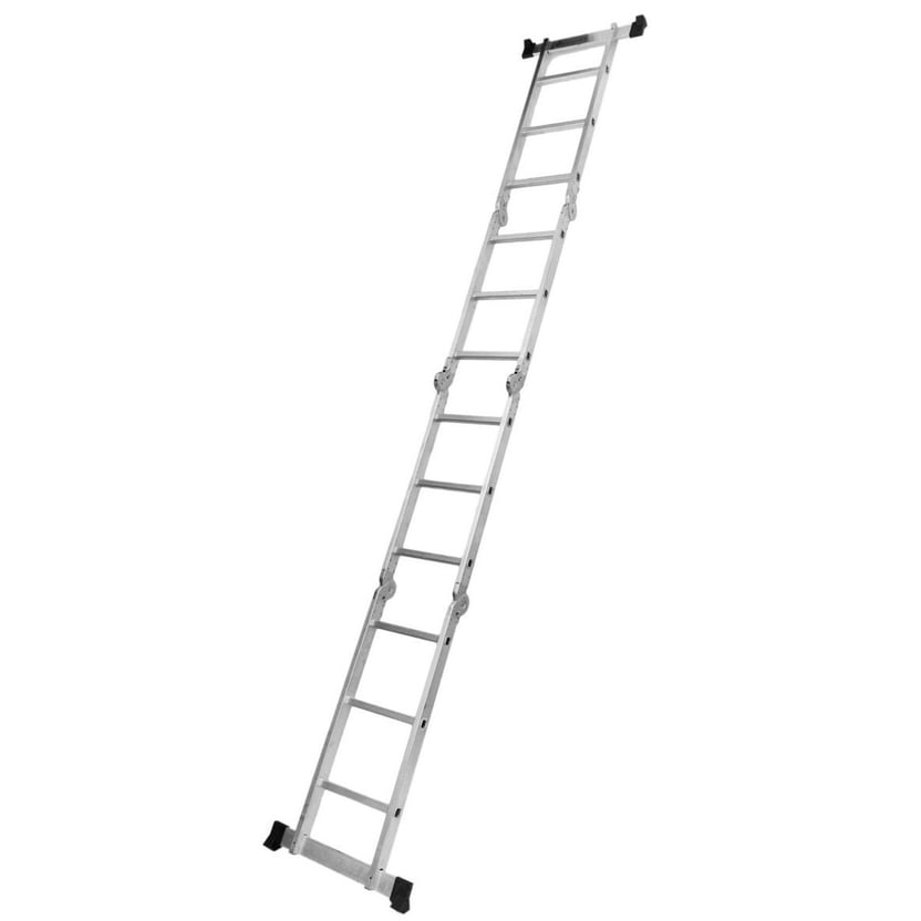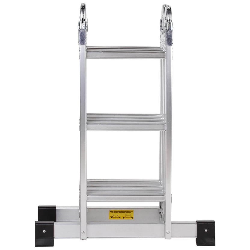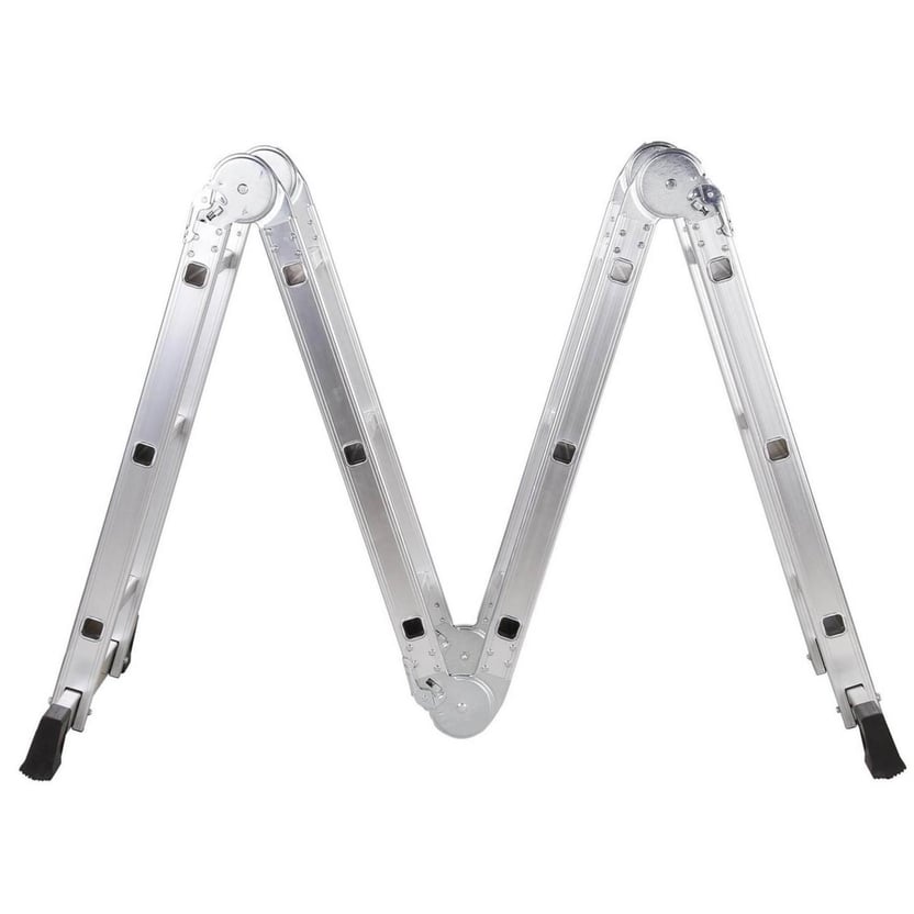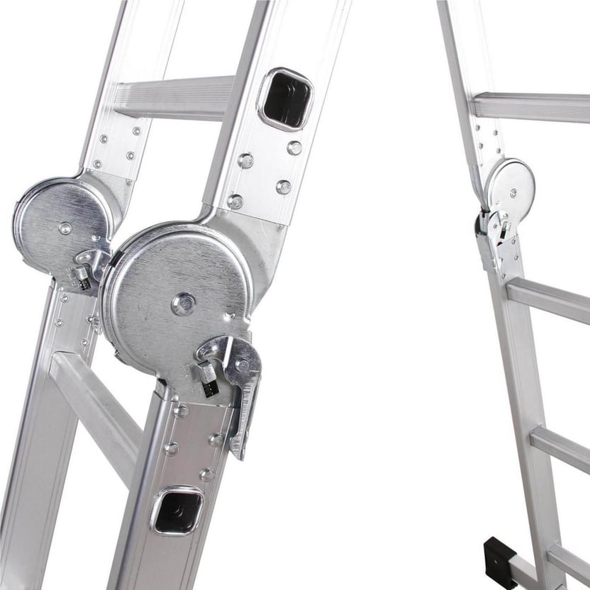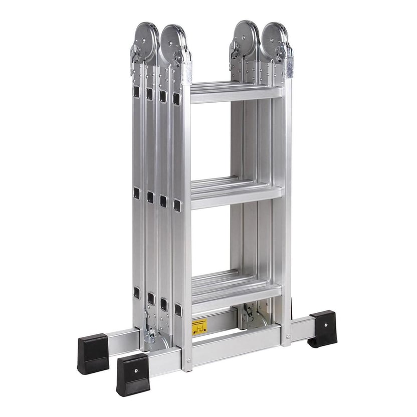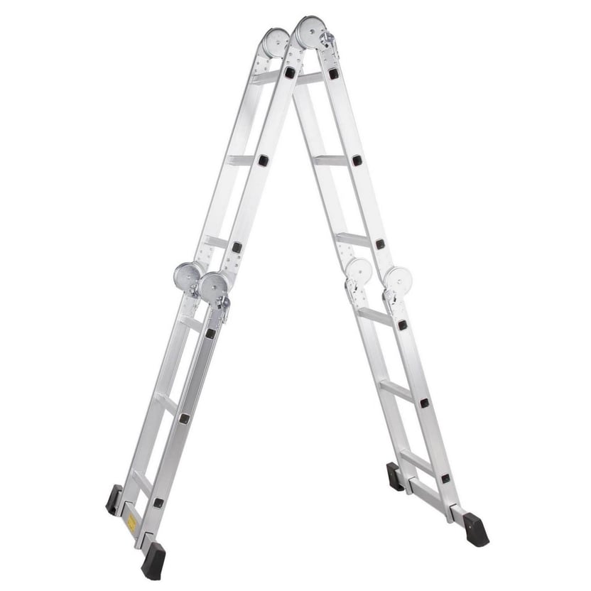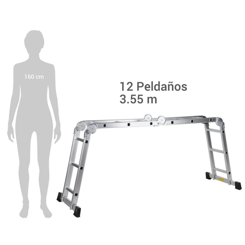 Con medidas de 3,6 metros de altura y 12 peldaños, es ideal para trabajos de pintura, e instalaciones de carpintería. Fabricada en aluminio, es liviana y fácil de transportar, y una herramienta muy segura gracias a sus topes antideslizantes. Ajustando sus bisagras articuladas, se puede usar como una escalera de extensión, una escalera de tijera, una mesa de trabajo o un caballete.