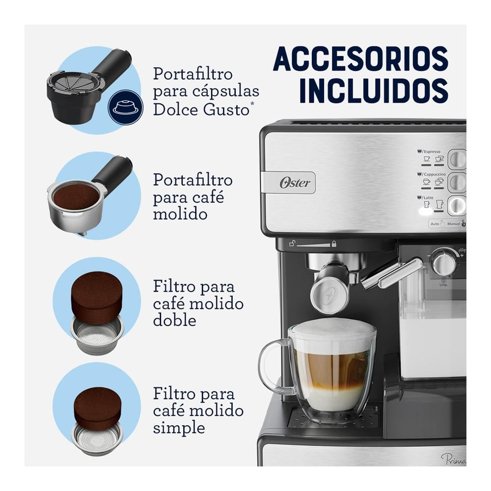 Vive la experiencia de un café auténtico y delicioso que ofrece la cafetera automática de espresso Oster PrimaLatte. Ahora con funciones que te permiten disfrutar variedades de bebidas, desde espresso, capuccinos y lattes, hasta el uso de cápsulas de Dolce Gusto. Todo al toque de un botón.Prepara tus bebidas favoritas utilizando tu marca predilecta de café molido, mientras automáticamente espumas la leche fresca de tu eleción. Todo servido en la misma taza, al momento que desees. También te ofrece un nuevo diseño, ¡Ideal para tu cocina!
