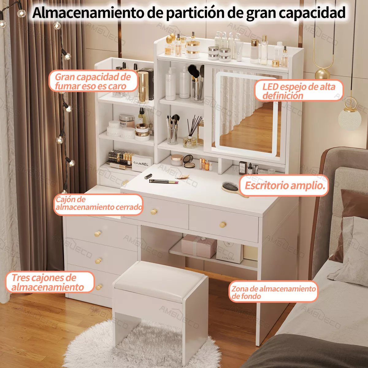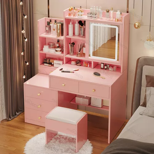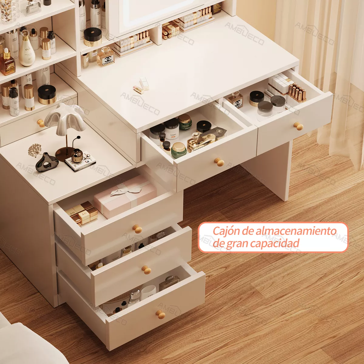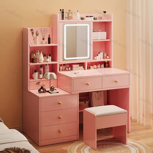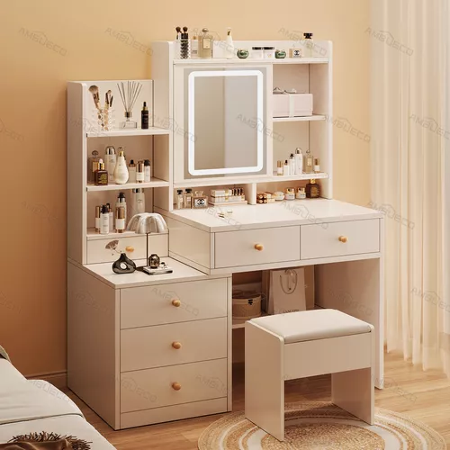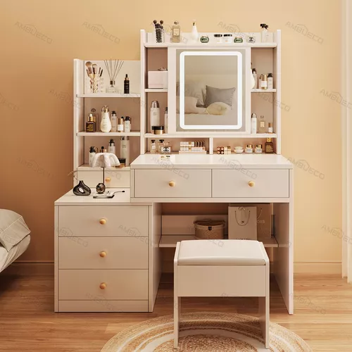 El espacio de almacenamiento cuidadosamente diseñado es como un mundo mágico de almacenamiento. Con 5 cajones grandes, 1 cajón pequeño y un área de almacenamiento abierto, todos ellos trabajan en conjunto, como un grupo de guardias leales y confiables, almacenando meticulosamente todos sus tesoros relacionados con la belleza, como productos para el cuidado de la piel, cosméticos, joyas brillantes y otras piezas preciosas. Los cajones grandes tienen un gran espacio de almacenamiento y pueden contener muchos artículos, mientras que el cajón pequeño está destinado especialmente a joyas y otros objetos pequeños y delicados. De esta manera, su mesa siempre se mantendrá limpia y ordenada como el lago tranquilo, lo que le permitirá encontrar fácilmente los artículos que necesita y disfrutar de un tiempo de maquillaje eficiente y cómodo.