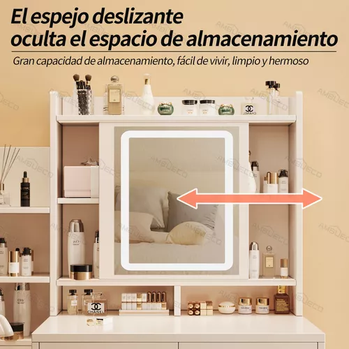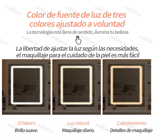 Este conjunto también viene equipado con un espejo único que tiene una corredera, lo que permite un movimiento fácil y suave, proporcionando una gran flexibilidad en su uso. El espejo tiene luces, con un total de 3 tipos de temperatura de luz, y el usuario puede ajustar libremente el color y la posición del espejo. Ya sea en la mañana o en la noche, cuando la luz es débil, puede satisfacer con precisión las diferentes necesidades en diversas situaciones de maquillaje. Es como una puerta mágica que conduce al reino de la estética de alta definición, capaz de mostrar una imagen clara, nítida y sin deformaciones, lo que hace que cada ocasión de maquillaje sea una experiencia placentera.