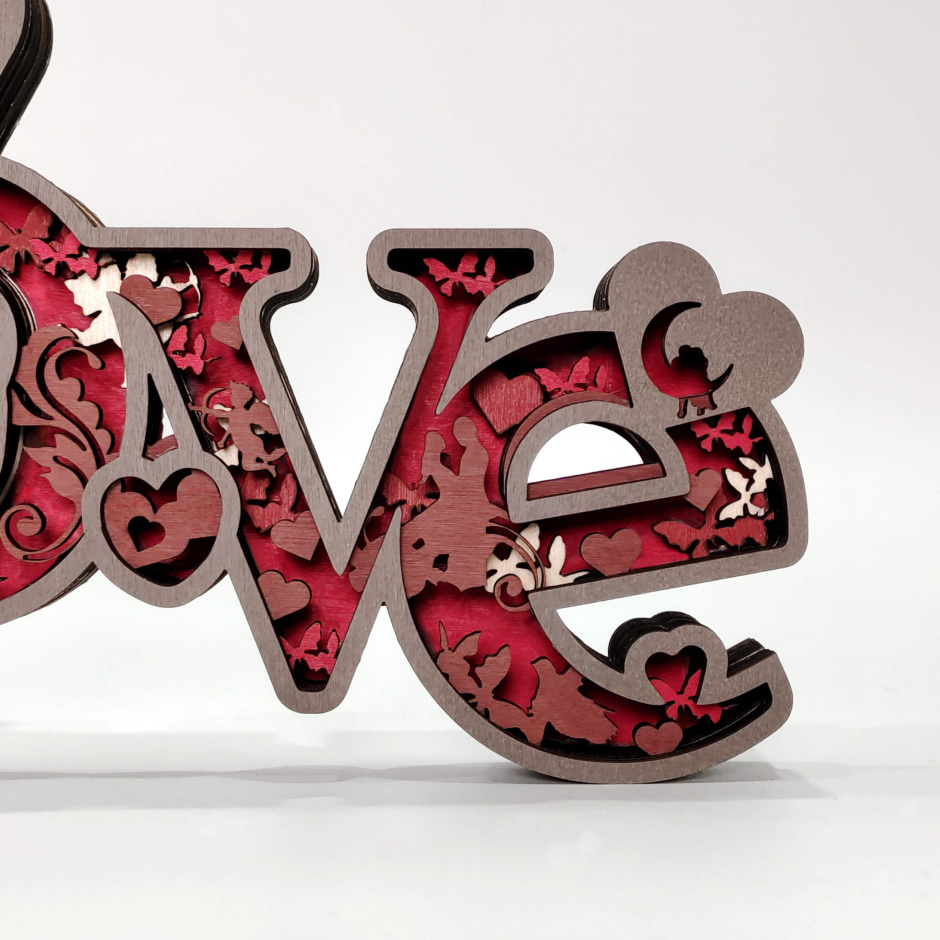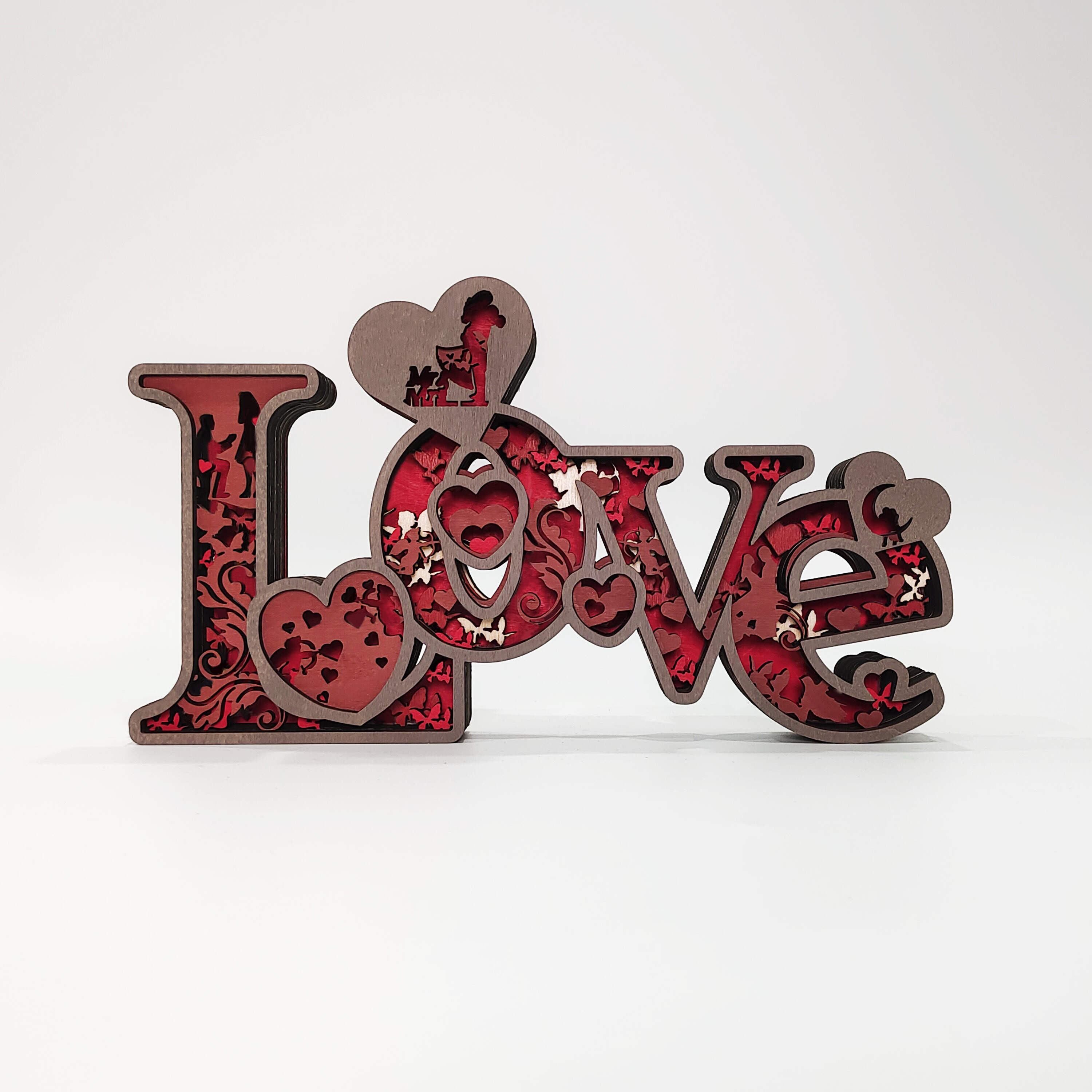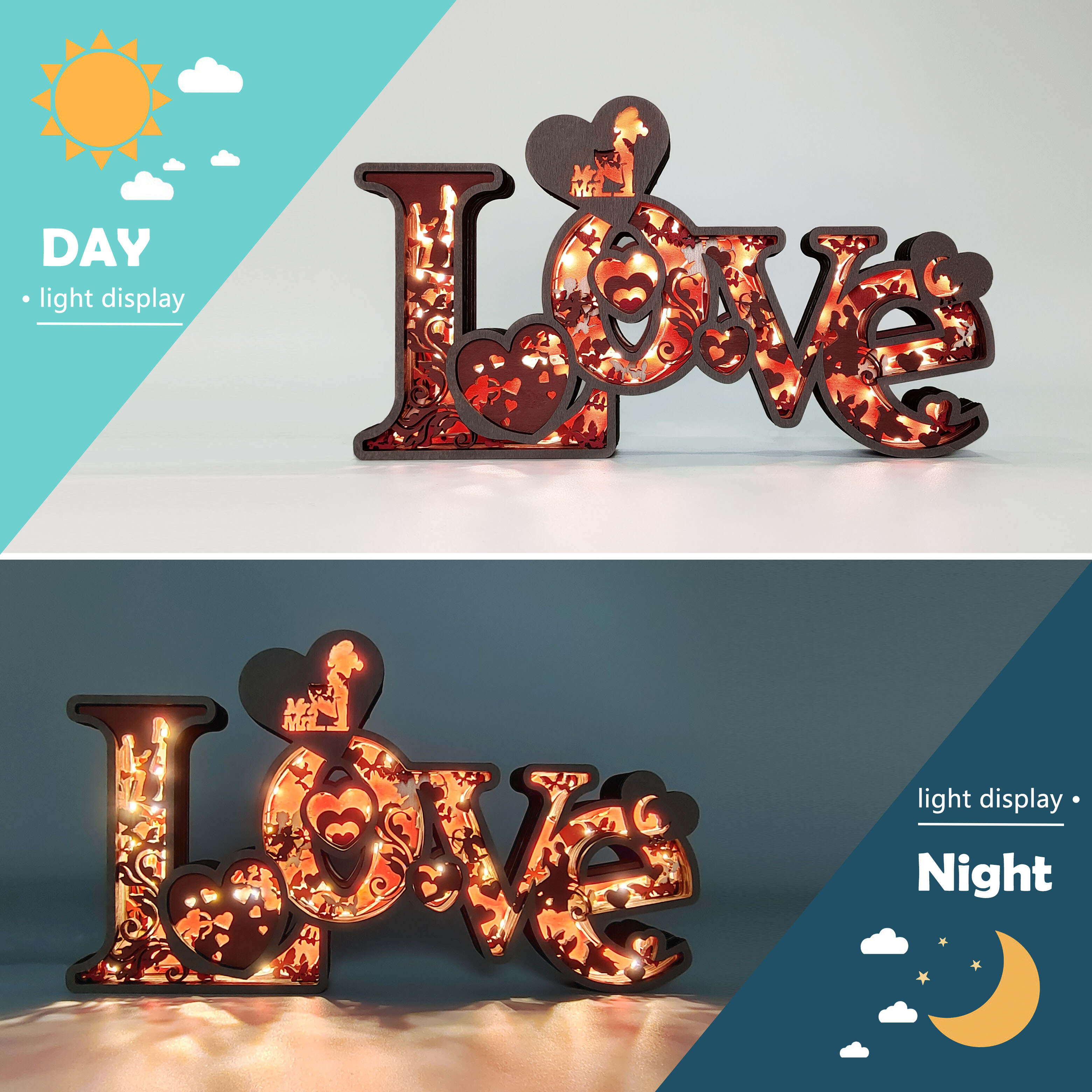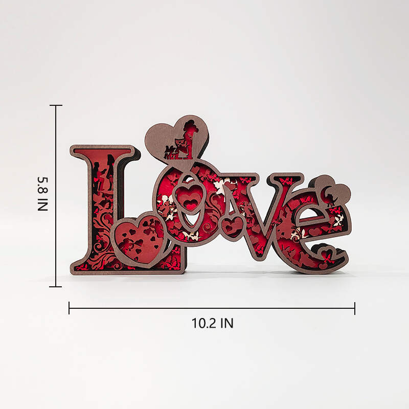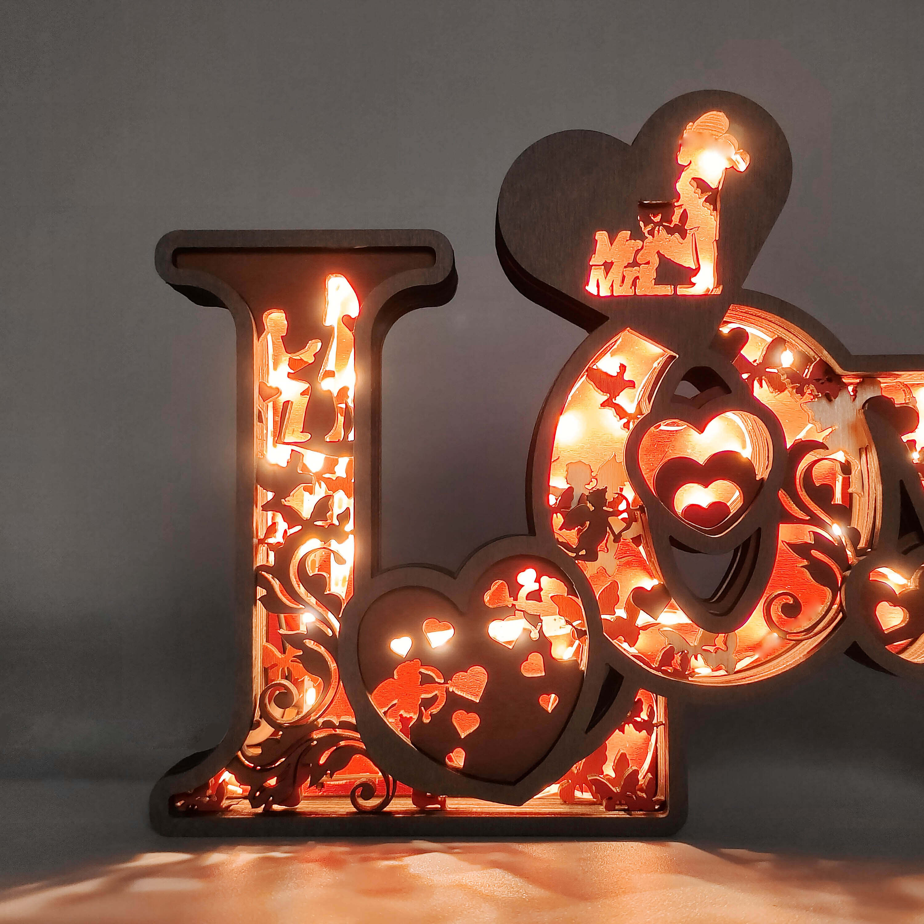 Love, cupid, rose,moon, hugs, this wooden night light describes a sweet picture.