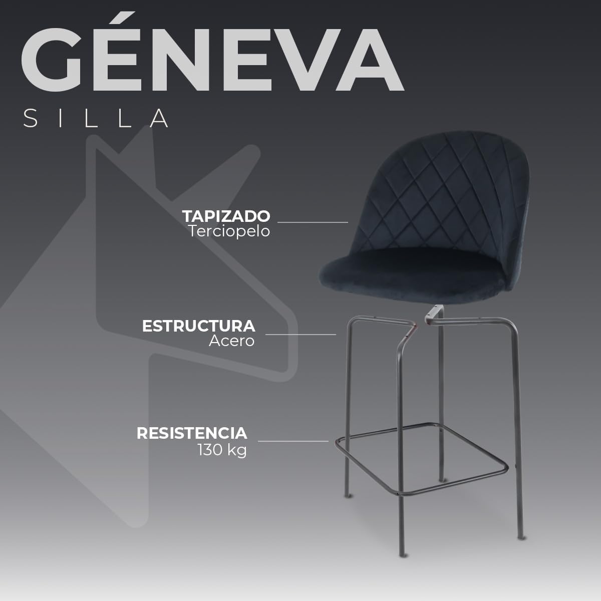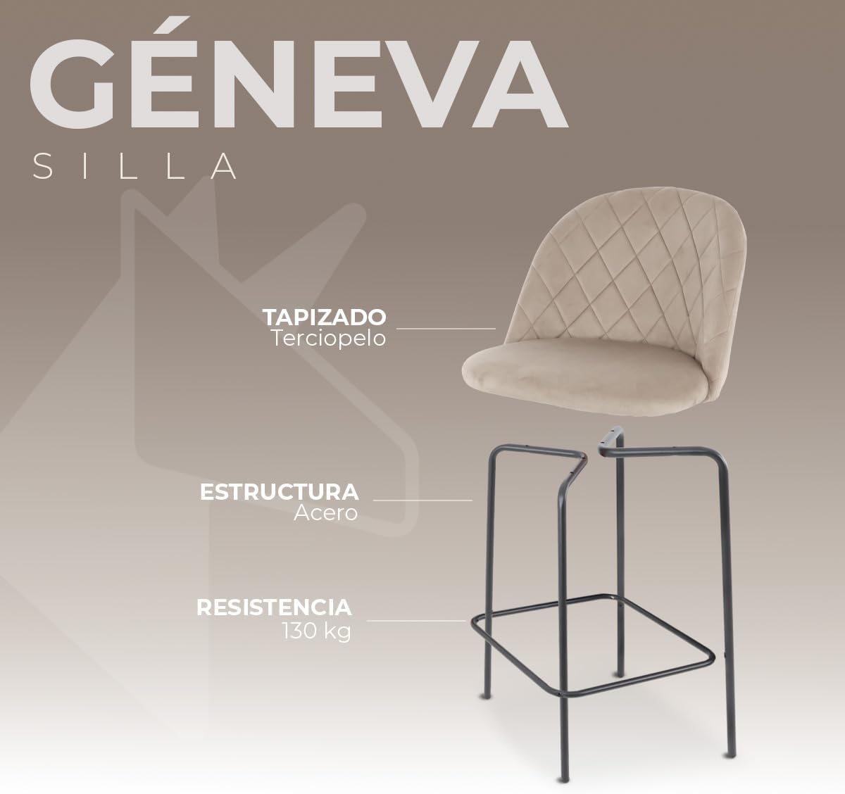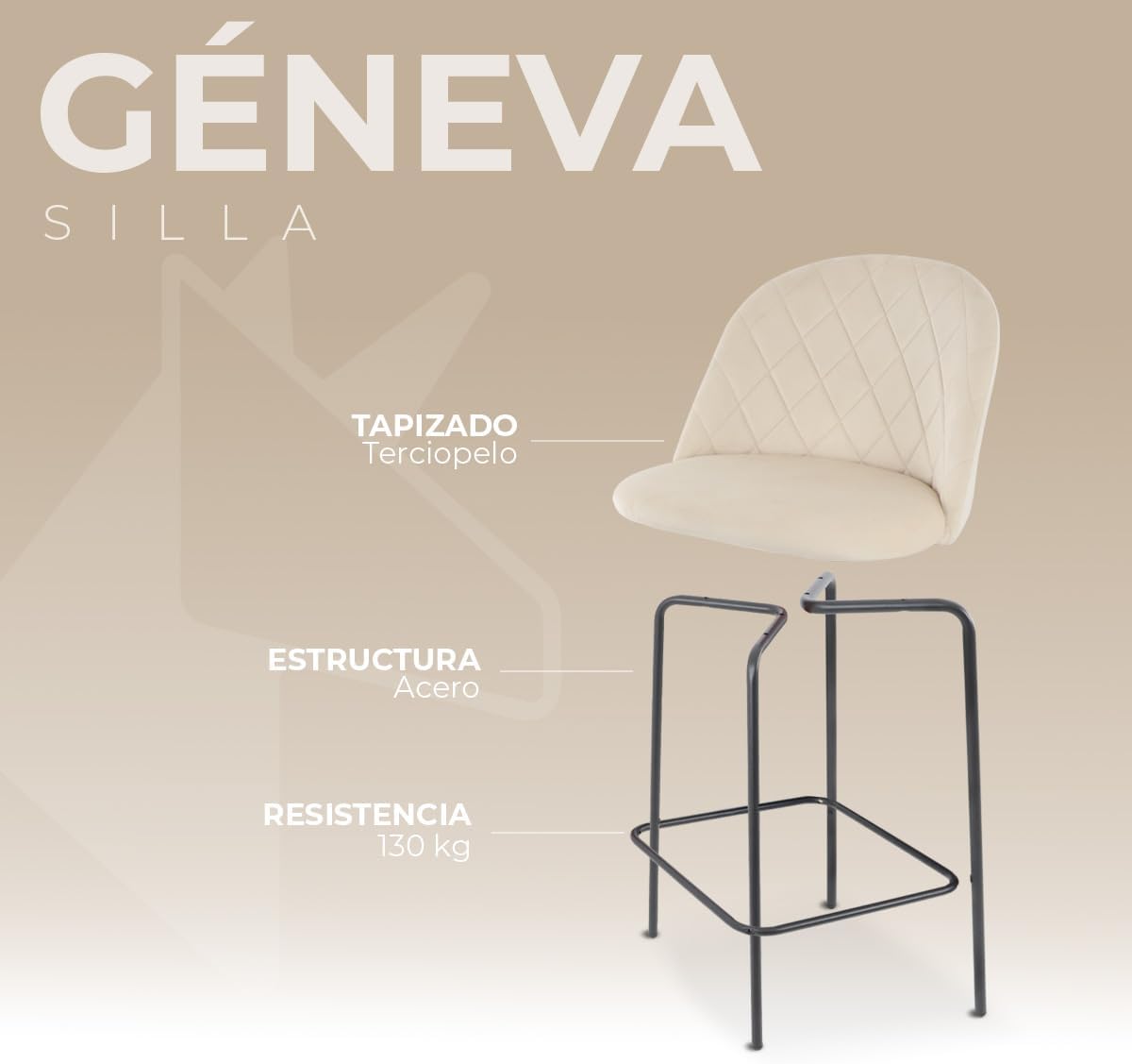 La Silla Alta Geneva combina elegancia y comodidad con un diseño sofisticado. Su estructura de acero con pintura electrostática y asiento tapizado en suave poliéster tipo terciopelo ofrecen un acabado de lujo y gran resistencia. El respaldo curvo aporta soporte ergonómico, ideal para largas sesiones en barras o mesas altas. Su diseño minimalista la convierte en la opción perfecta para cocinas, bares y áreas sociales.