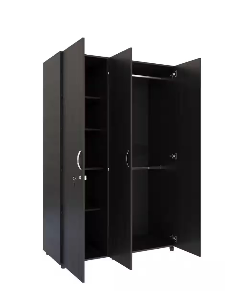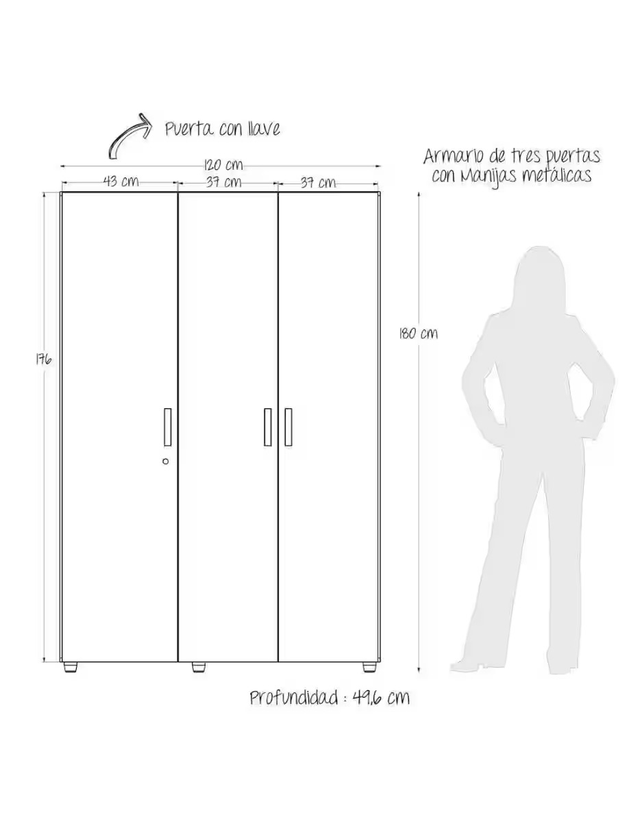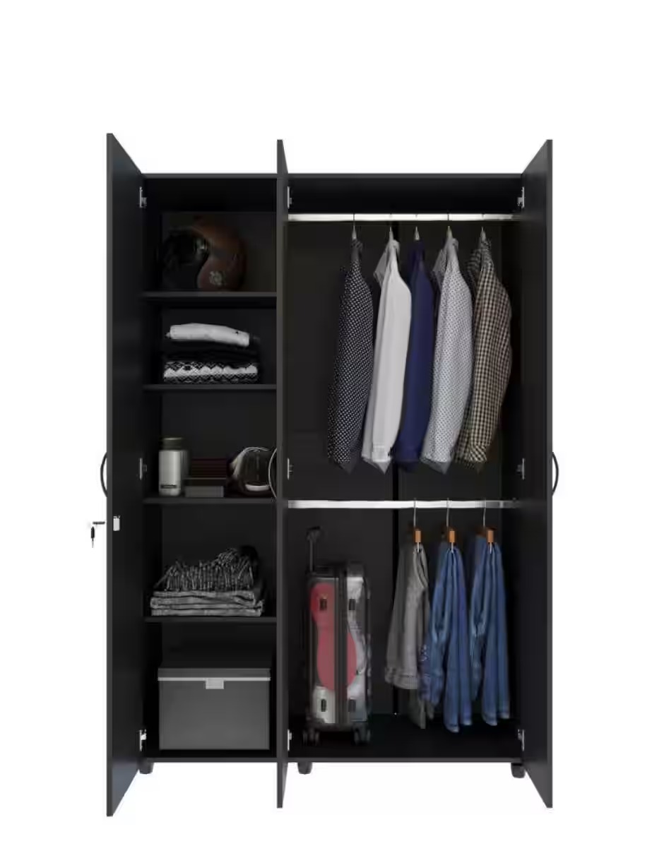 El Closet/Ropero Bilbao es ideal para espacios pequeños, cuenta 3 puertas abatibles con manija metálica (una tiene chapa de seguridad), 2 tubos para colgar prendas como jeans, vestidos o abrigos y 5 espacios para guardar ropa doblada o zapatos. Este producto es fabricado y ensamblado en México; está fabricado en tablero aglomerado o MDP con recubrimiento melamínico, logrando dar estabilidad y durabilidad al mueble. Los herrajes son metálicos y cuenta con 5 años de garantía en las partes de madera y 1 año en la herrajería. Nuestra madera proviene de bosques 100% cultivados.