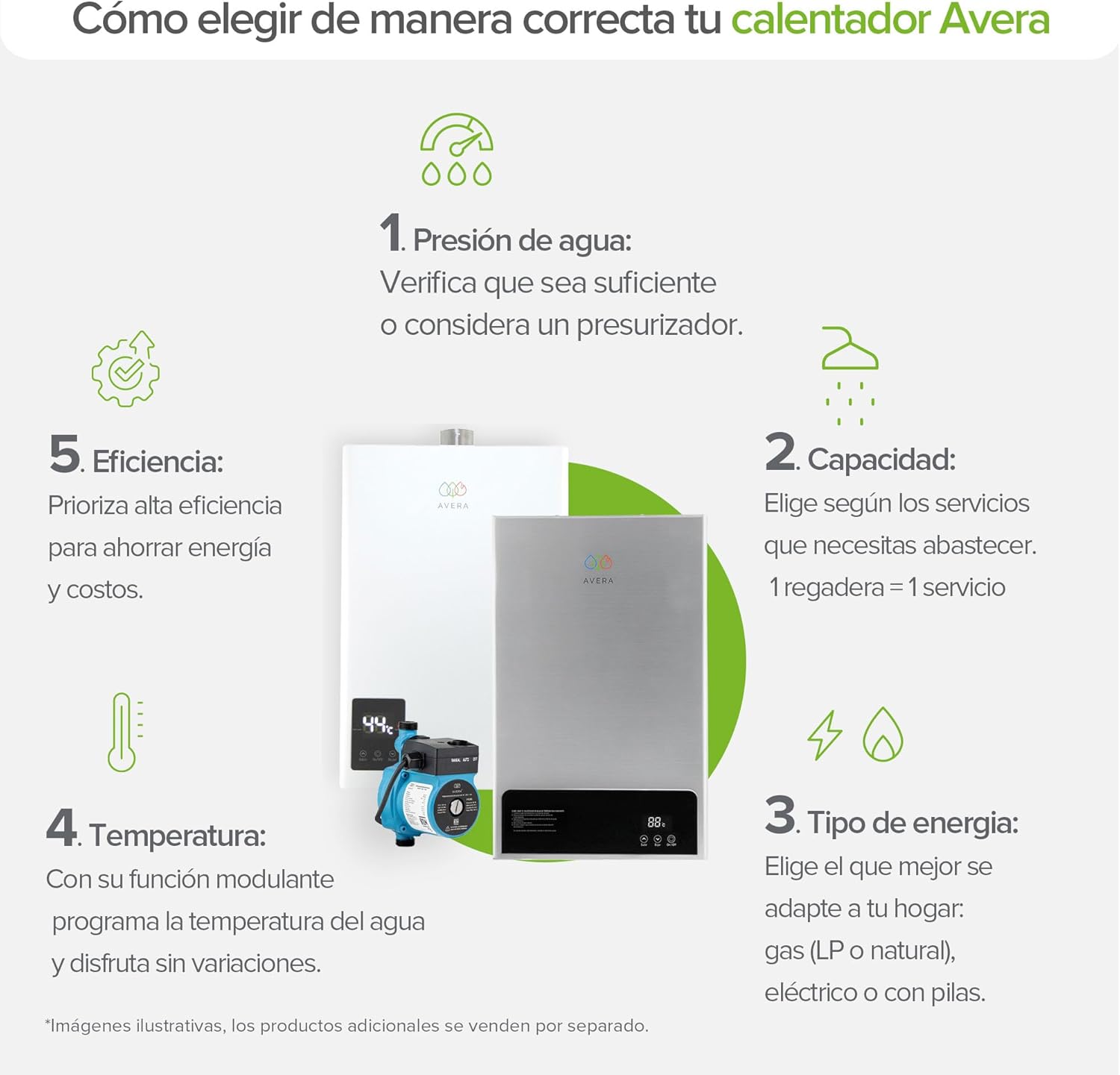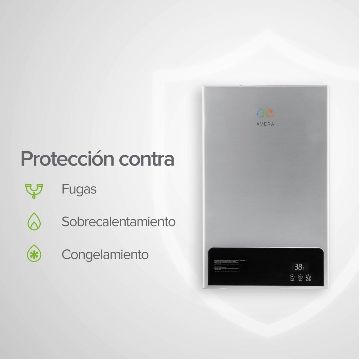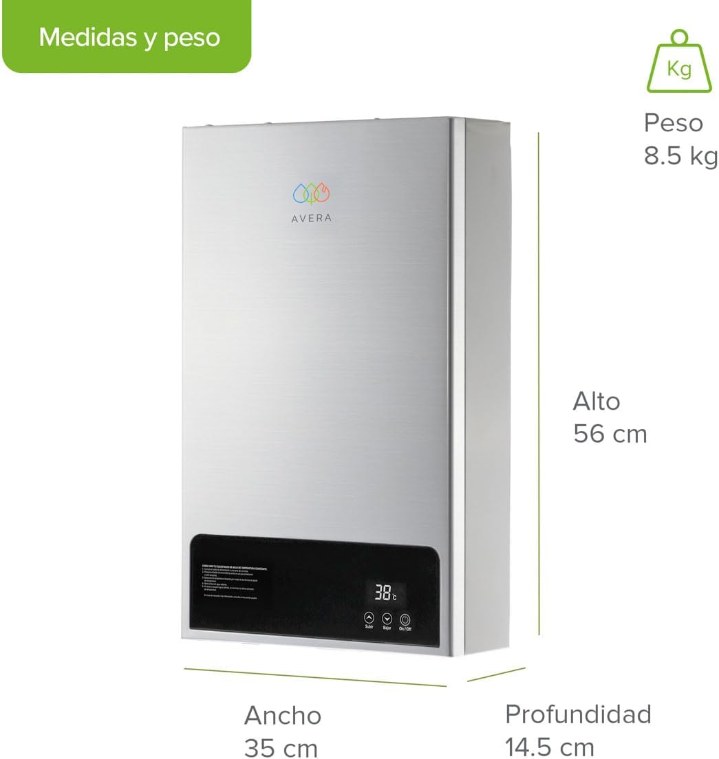 El calentador de agua instantáneo modulante AVERA CM10 es la solución ideal para disfrutar de agua caliente sin esperas ni sorpresas. Con su avanzada tecnología, este boiler de paso gas lp no solo te brinda un flujo constante de agua caliente, sino que también te permite ahorrar gas, garantizando un confort superior y seguridad en tu hogar. Es perfecto para quienes buscan eficiencia y un rendimiento excepcional. Beneficios: El AVERA CM10 es un calentador de paso de última generación, con una capacidad de 10 litros por minuto, ideal para abastecer hasta 2 servicios simultáneos. Olvídate de los cambios bruscos de temperatura; este calentador de agua modulante ajusta automáticamente la temperatura para mantenerla constante, sin necesidad de mezclar con agua fría. Su diseño ultra-delgado y su panel digital con pantalla LED no solo lo hacen visualmente atractivo, sino también increíblemente fácil de usar. Uno de sus mayores beneficios es el ahorro de gas LP que proporciona, gracias a su sistema de combustión forzada que optimiza el consumo. A diferencia de otros calentadores de agua, el CM10 tiene un encendido progresivo y automático con tan solo 0.080 MPa de presión de agua, lo que lo hace perfecto incluso en hogares con baja presión. La seguridad es una prioridad: cuenta con un sensor de temperatura de agua, doble válvula de gas, protección antiflama y un sistema de corte automático en caso de flujo de agua o sobrecalentamiento. El boiler de paso para 2 servicios también tiene un filtro de agua removible para facilitar el mantenimiento y asegurar su durabilidad. El calentador instantáneo AVERA CM10 es la combinación perfecta de rendimiento, seguridad y eficiencia. Fácil Instalación y Operación El boiler de paso gas lp CM10 se instala de forma segura y sencilla, siguiendo las instrucciones del manual. Su panel digital te permite ajustar la temperatura entre 35°C y 65°C con solo tocar un botón, mientras la pantalla LED muestra la temperatura en tiempo real. Además, incluye un sistema de diagnóstico con código de errores que facilita su mantenimiento