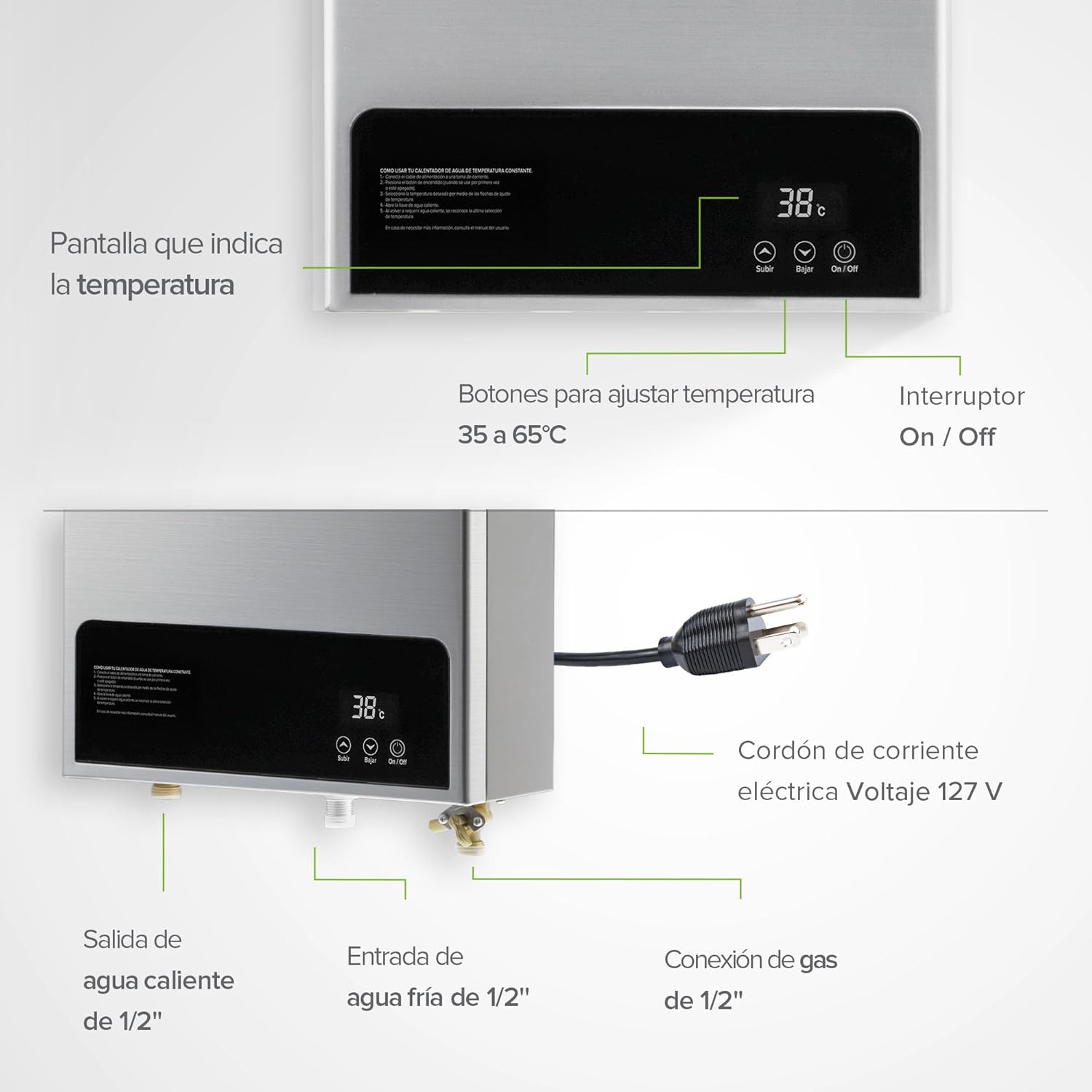 • Diseño delgado, pantalla LED y panel digital. Este calentador de agua modular es fácil de instalar y usar.