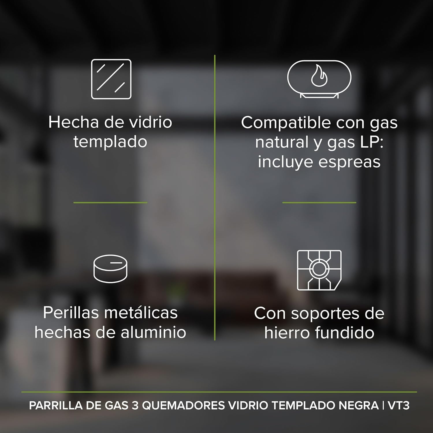 - Con 3 quemadores y soportes de hierro fundido, tu parrilla está lista para aguantar las batallas más fuertes en la cocina, pues sus materiales son resistentes y duraderos.