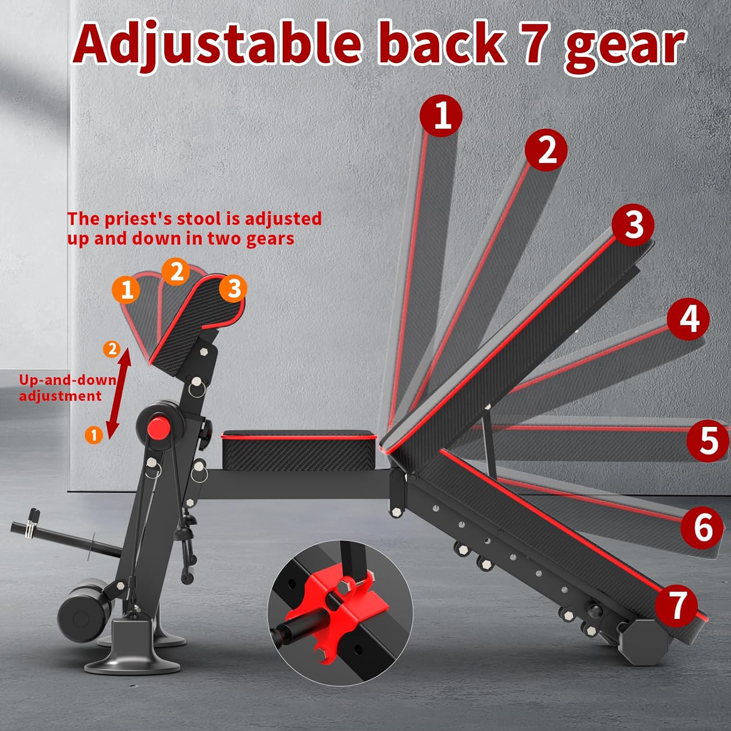 • [Banco de peso ajustable]: el banco de mancuernas está diseñado con 7 posiciones de cojín del respaldo y 3 ajustes de tope, fácil de ajustar, un segundo para completar el ajuste. Puedes cambiar a la posición correcta a voluntad durante el ejercicio, mejorar eficazmente el efecto y el tiempo de todo el ejercicio del cuerpo y aumentar el efecto de moldeo muscular