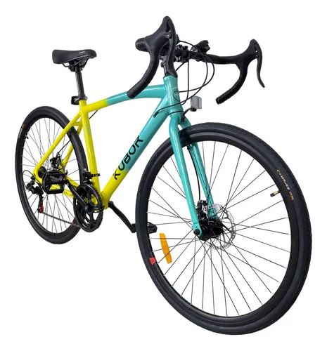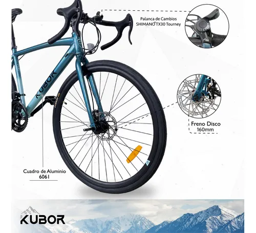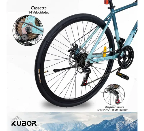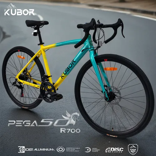 Bicicleta KUBOR liviana, estable y capaz de darte los elementos que requieres para una carrera en pista. La PEGASO50 combina las cualidades suaves y cómodas de un cuadro de aleación de aluminio, la horquilla cuenta con un rendimiento de calidad. Incluye una transmisión Shimano Tourney TZ de 2x7 y frenos de disco mecánicos para lograr una bici de pista rápida, perfecta para paseos en grupo competitivos e incluso para carreras.