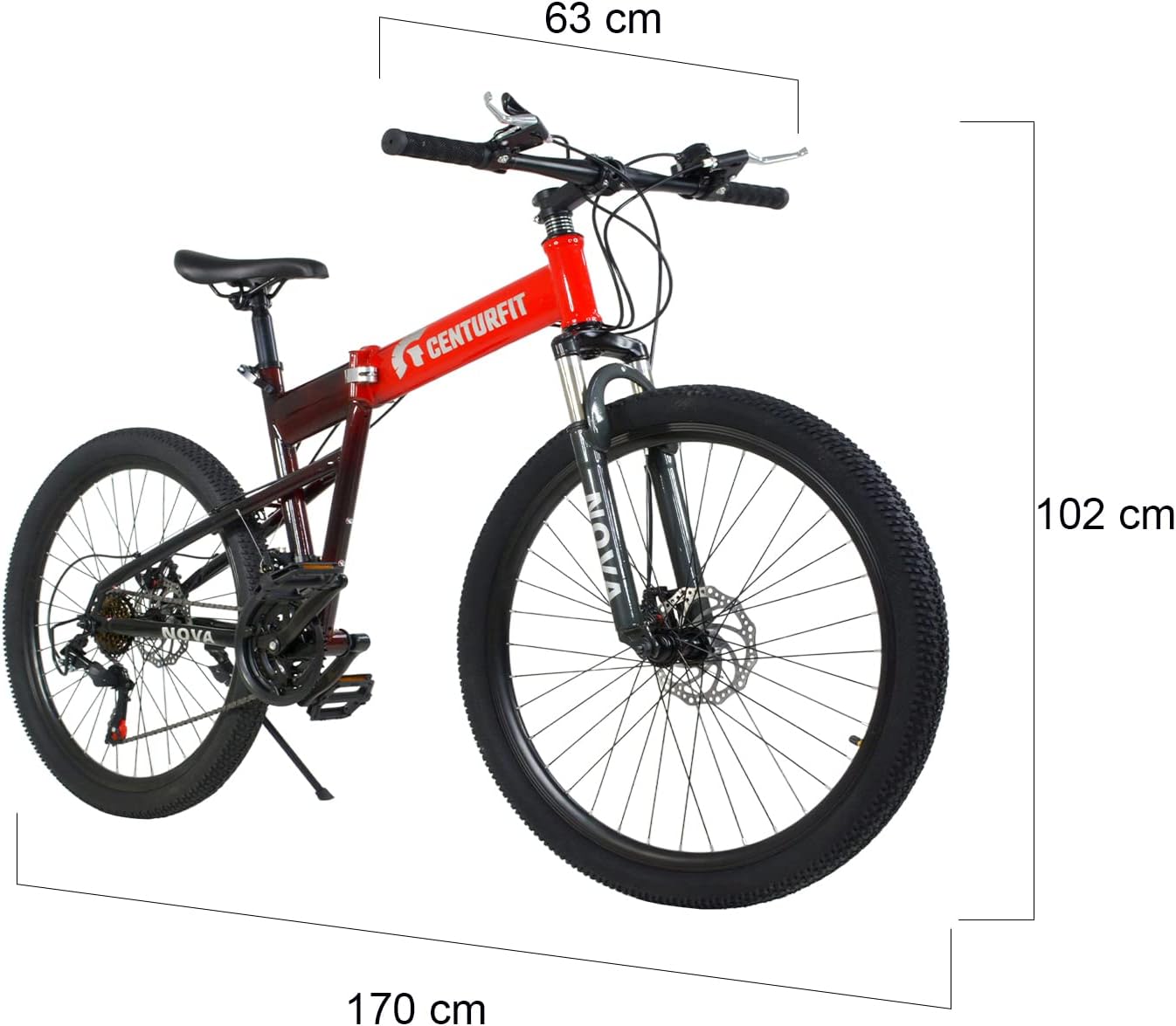 [Bicicleta plegable para montaña] [Frenos de disco] [Sistema de amortiguación delantero] [21 ajustes de velocidad] DATOS TÉCNICOS Características de las ruedas - Rodada 26 - Ruedas de nylon - 36 rayos de acero - Inflar: máximo 65 psi minimo:40 psi - Medidas: 26 x 2.125 (57-559) - Ancho: 50mm Velocidades: - 21 velocidades - Freno delantero - Freno trasero Capacidad de carga: 120 kg Altura del manubrio: 98 cm Altura máxima del asiento: 101 cm Altura mínima del asiento: 87 cm Tipo de frenos: - MARCA: BOLIDS - FRENOS DE DISCO - DIÁMETRO:15 CM - GROSOR: 2 mm - TIPO DE BALATAS: TP 11-E Medidas del asiento: 27 X 15.5 X 3 cm - Pedales sencillos de plástico con reflectores a los costados Horquilla: - Recorrido:11.5 cm - Diámetro del tubo exterior: 3.2 - Diámetro del tubo interior: 2.6 cm Herramientas necesarias para el armado no incluidas: - Perico (llave inglesa) - Llaves Allen (4 y 5mm) Medidas de los pedales: 9 X 9 X 22 cm Medida de la potencia: - Potencia de aluminio - Diámetro para manubrio: 31.8mm - Longitud del diámetro de la potencia al diámetro del manillar: 80mm - Ancho: 38mm - Diámetro del tubo de dirección: 28.6mm Grosor de tubulares: - Tubular central: 38 x 80 mm - Tubulares inferiores de cuadro: Diámetro de 38 mm Longitud del eje delantero: Eje de conexión rápida de 14 cm Longitud del eje trasero: 18 cm RIN: - Aluminio - Ancho interno: 20.6 mm - Profundidad: 11.4 mm Cambios: - Saiguan 42 T - Cambios de gatillo y botón Distancia entre ejes: 103.5 cm Piñón mayor central: 42 dientes Piñones traseros: - 7 piñones - Piñón mayor de 28 dientes - Piñón menor de 14 dientes Tipo de dirección: Dirección integrada INCLUYE - Bicicleta semi armada con rueda trasera - Rueda delantera - Freno delantero - Pedales - Asiento - Tubo de asiento - Manubrio MEDIDAS DEL PRODUCTO Largo: 170 cm Ancho: 63 cm Alto: 102 cm PESO DEL PRODUCTO 15.5 kg MEDIDAS DEL EMPAQUE Largo: 136 cm Ancho: 23 cm Alto: 72 cm PESO DEL PRODUCTO EMPACADO 16.5 kg