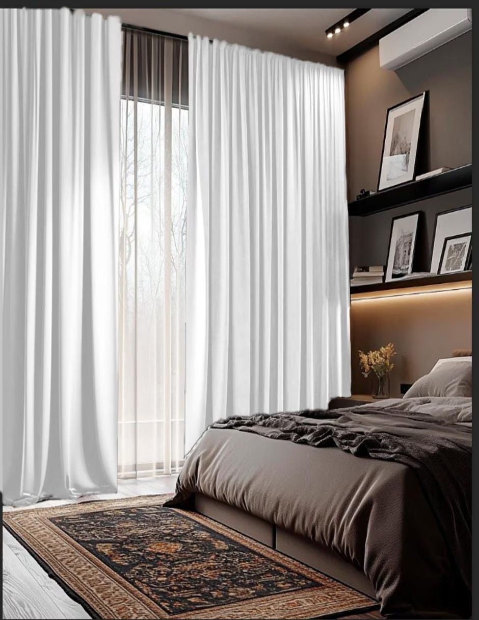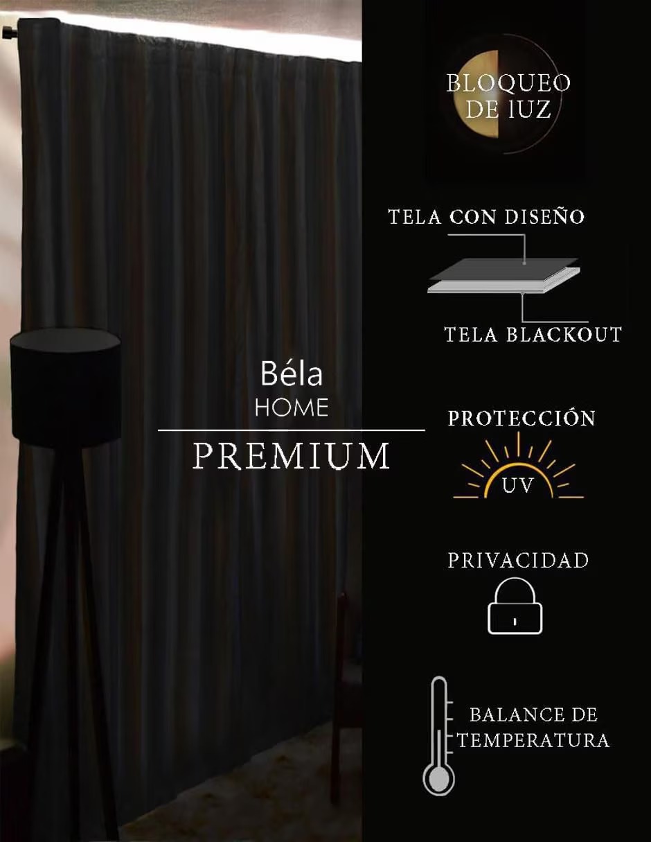Cortinas Blackout, Blackout de verdad. Controla el paso de la luz con elegancia. Para cortinero tubular. Incluye: -2 Lienzos Blackout -1 Velo de obsequio Para una ventana Medidas: Un lienzo Blackout extendido: 1.30m ancho x 2.30m alto Dos lienzos Blackout extendidos: 2.60m ancho x 2.30m alto El velo de obsequio mide lo mismo que un lienzo Todas las medidas tienen ±3cm de tolerancia Ventajas: Bloqueo de luz: Oscurecen como cueva de oso. Set completo de 3 piezas: 2 lienzos Blackout que oscurecen y 1 velo que filtra luz. Acabados increíbles: Hechas para dar un look elegante y moderno. Beneficios térmicos y acústicos. Fáciles de instalar: Para cortinero simple o de doble tubo. Privacidad: Para que no te vean tus vecinos. Geniales para: recámara, sala, comedor, oficinas. ¡Pídelas más anchas que la ventana! Béla, mejores telas, mejores acabados, mejores productos. Composición: Los lienzos de color tienen dos capas de tela: 1.Tela 100% poliéster grueso de color que da vista a la decoración 2.Tela Blackout al reverso, diseñada para oscurecer. El velo es de tela 100% poliéster Peso total del juego 2.30m alto x 2.60m ancho 3.35kg Lavable en casa, no uses cloro, usa ciclo suave para ropa delicada.