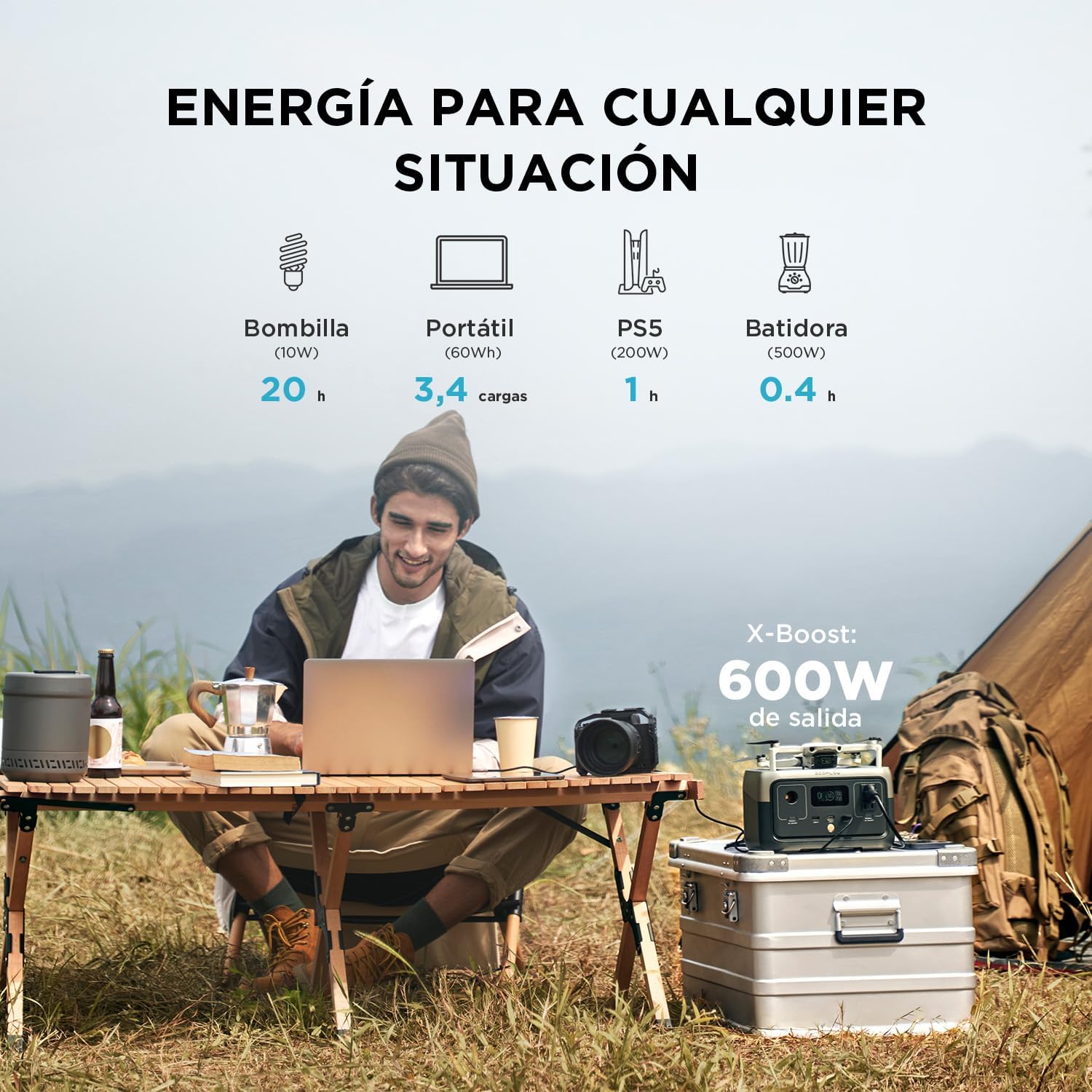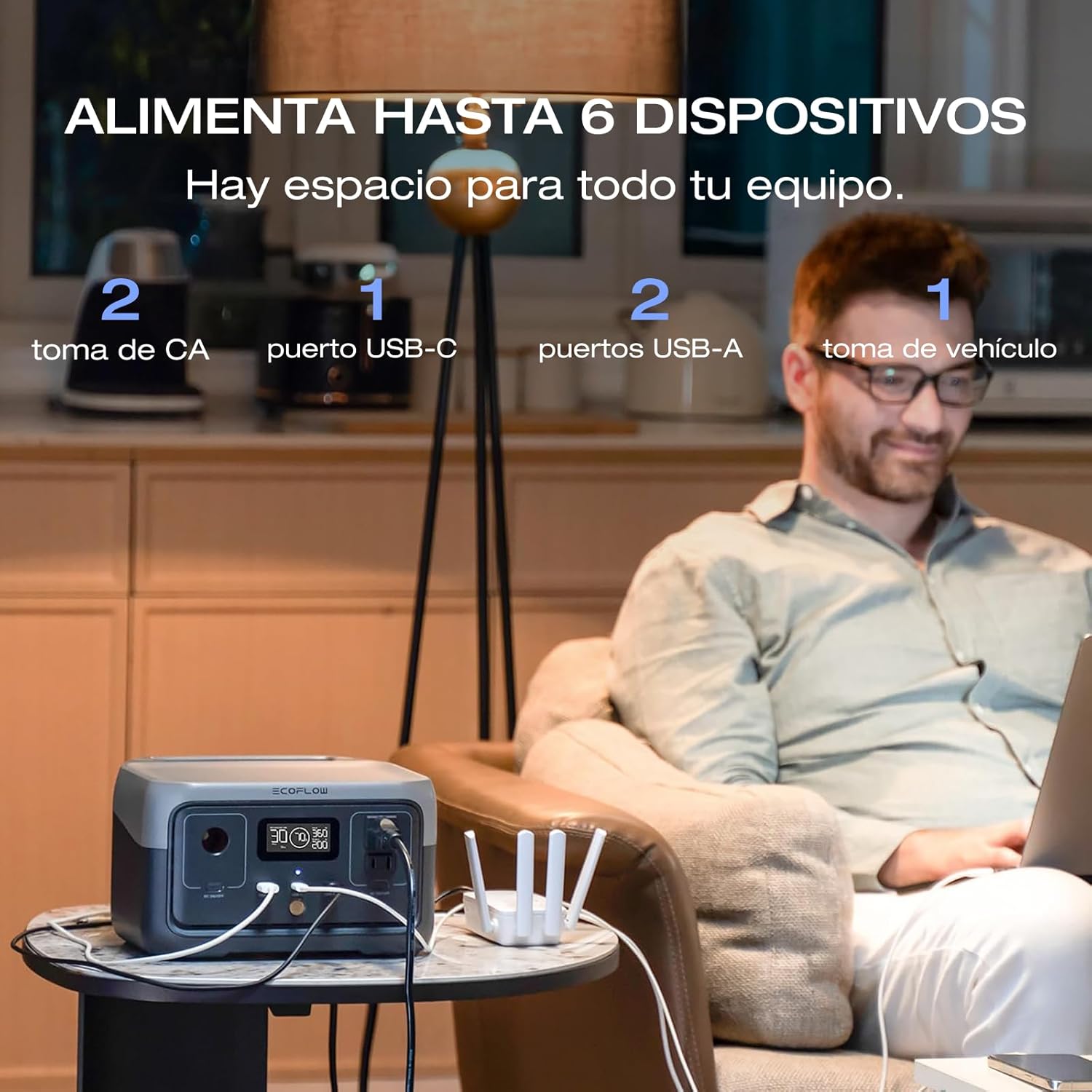 • Potencia todos tus elementos esenciales: con una salida de hasta 600 W, ejecuta 6 dispositivos esenciales simultáneamente sin preocuparte por la sobrecarga. Con una gran cantidad de puertos, desde salidas de CA de 300 W a USB-C, tenemos todos los enchufes de tu dispositivo cubiertos.
